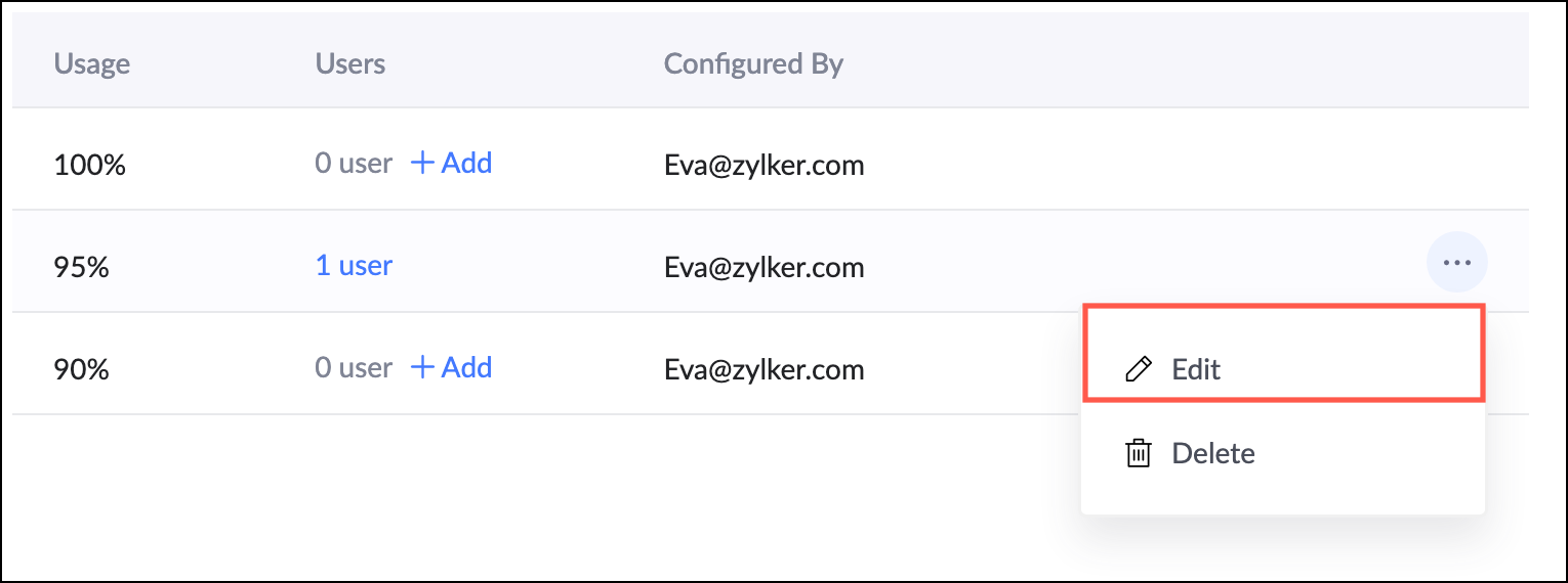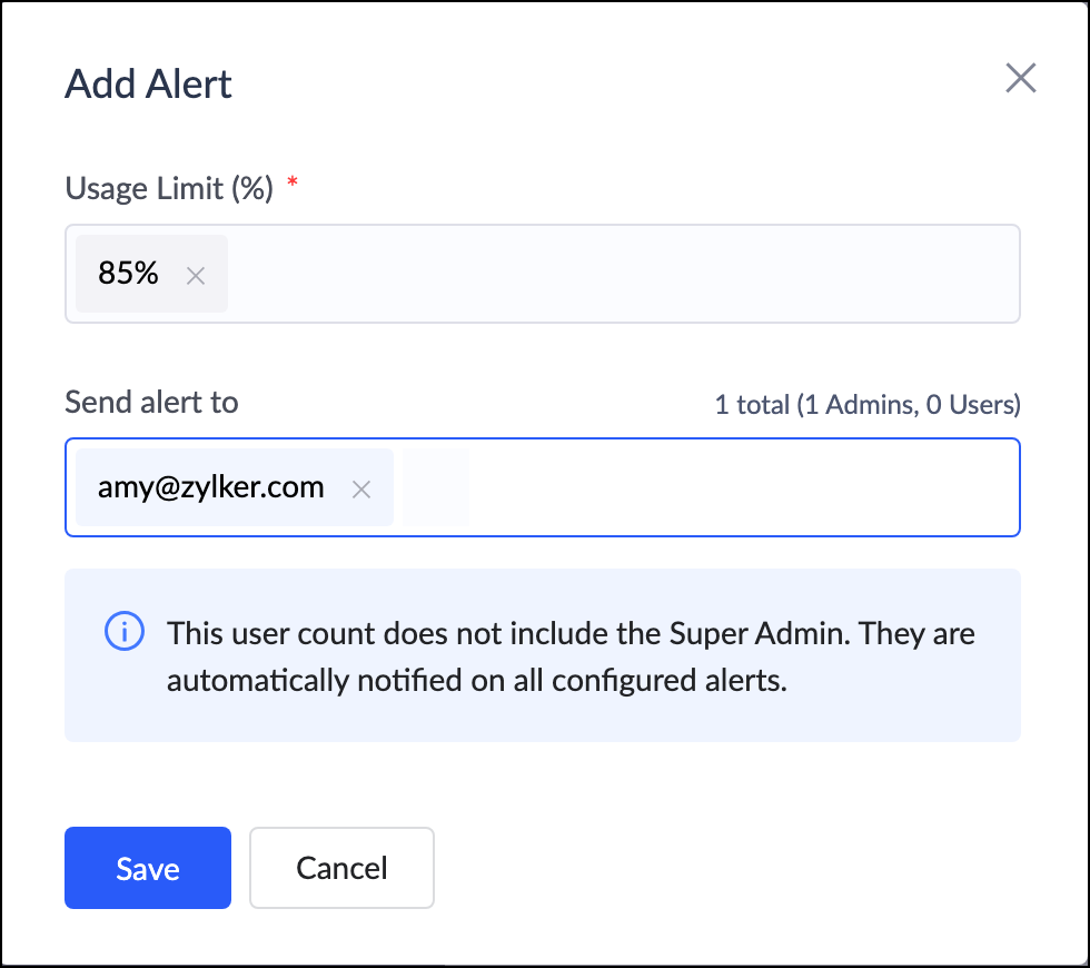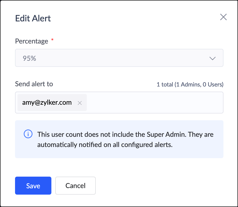 - The usage alerts for 90% and 100% thresholds are preconfigured for each module other than records. You can edit to add more users or delete the alert if needed.