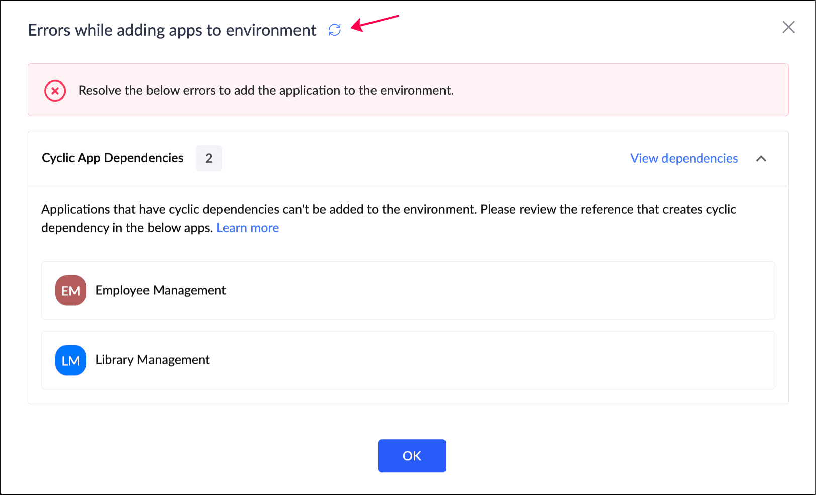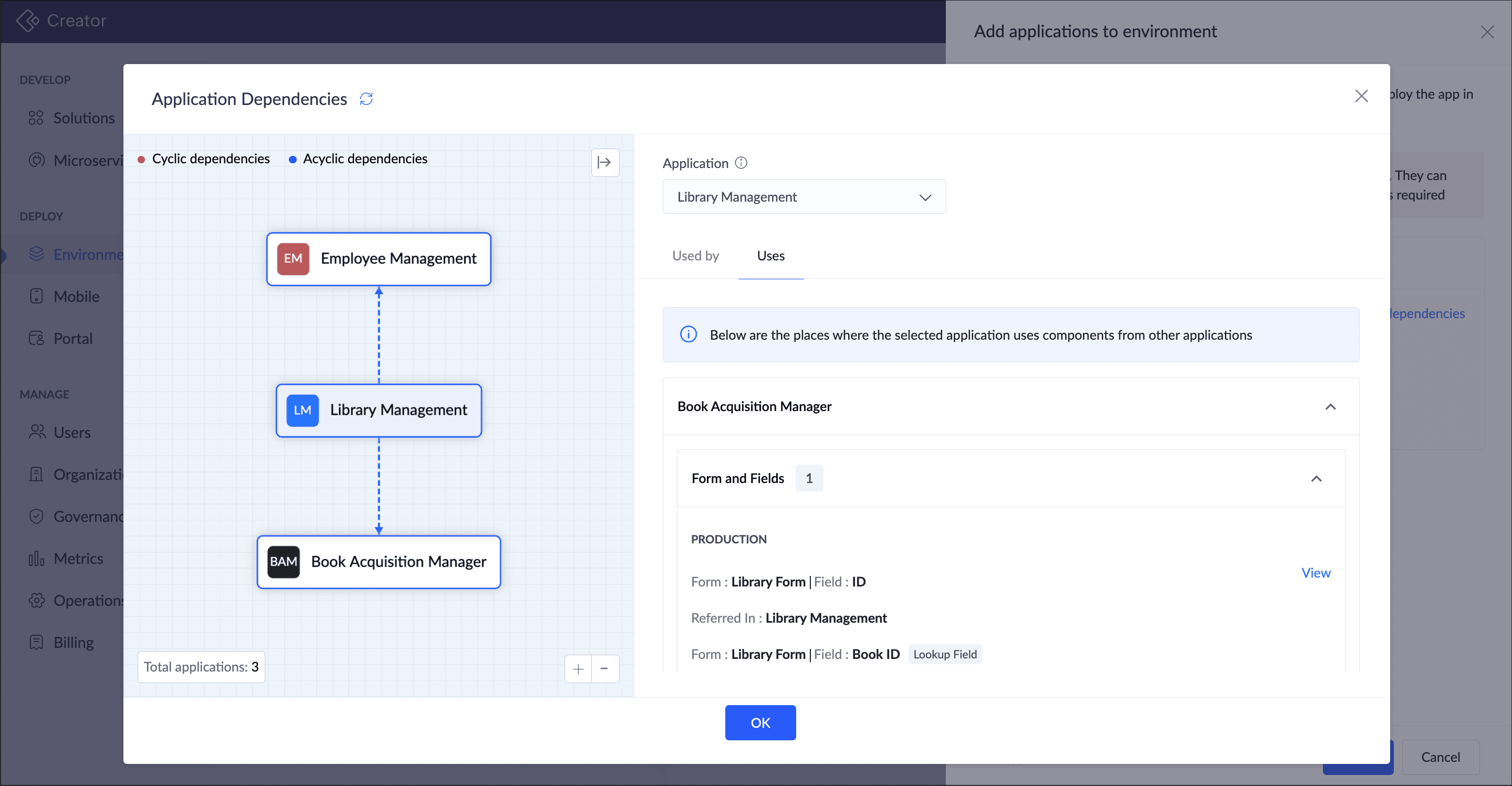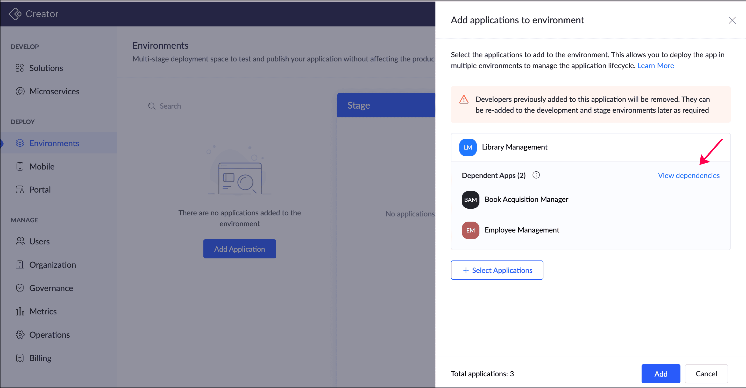 When an application having dependencies with other apps is added to the environment, its dependent apps will be automatically listed, and they must be added together to the environment. Imagine that in a Library Management application, there is a page Library Dashboard in which a form Add Employee from the Employee Management application has been embedded. Now, both Library Management and Employee Management apps are dependent apps to each other. To add any one of these apps to the environment, both should be added together to the environment.
