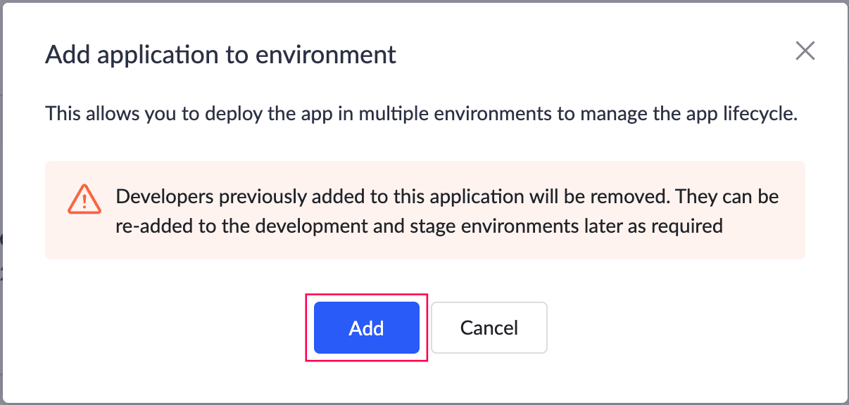 Note: When the environment is enabled, existing users with the Developer role will be removed from the application. They can be re-added for development and stage environments as needed. Click here to learn more about adding a developer to the application. Applications can be added to the environments in the following instances: