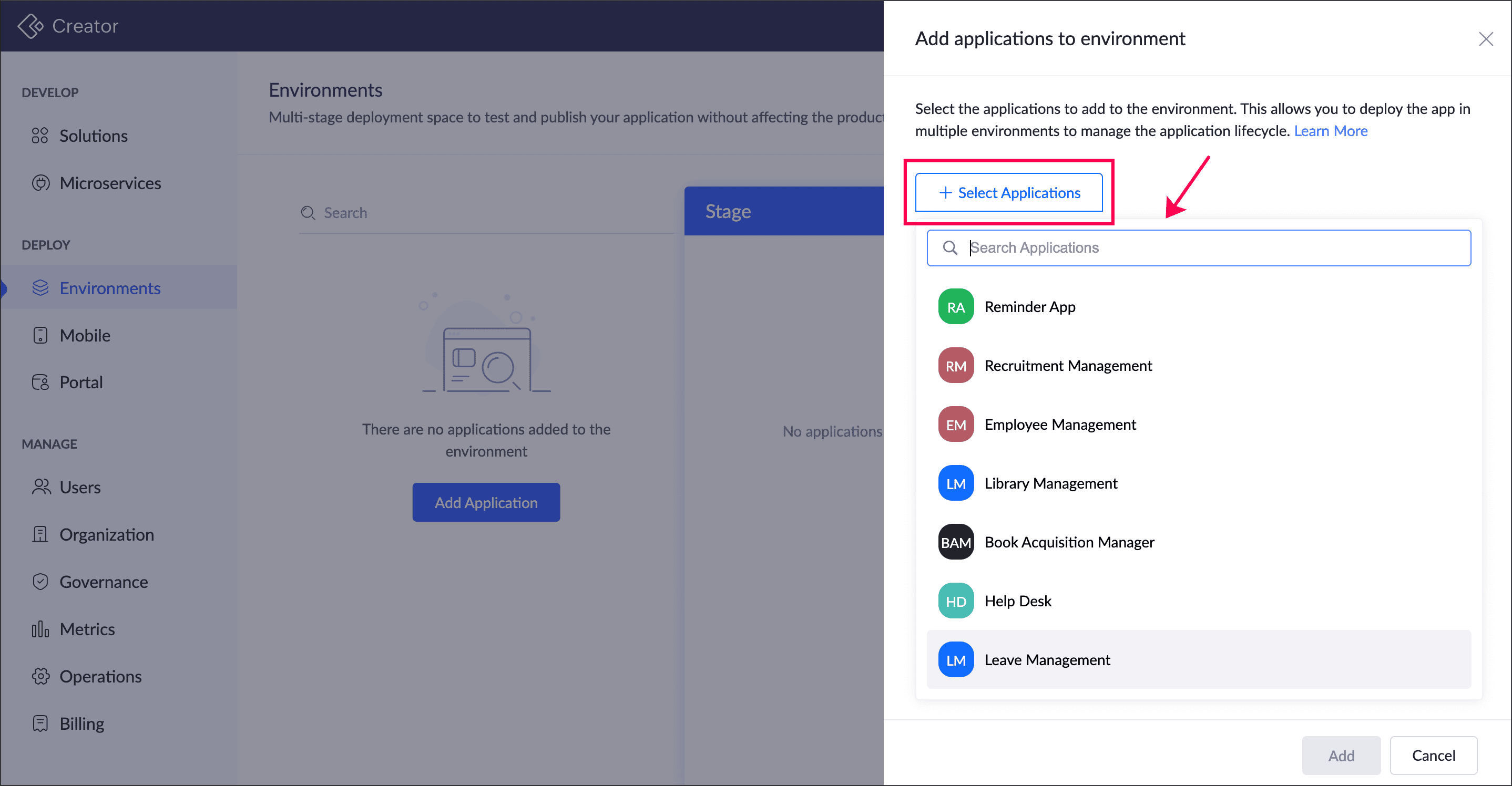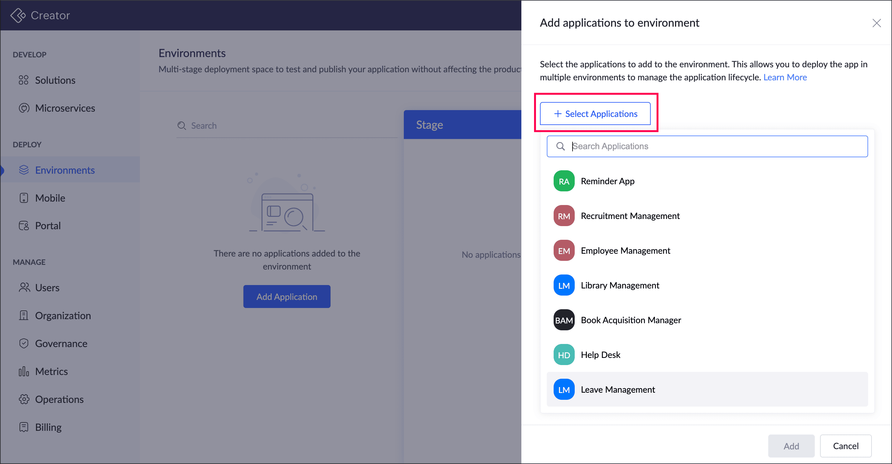 - In the Add applications to environment pane, click the + Select Application button. Choose the required applications that need to be added to the environment.