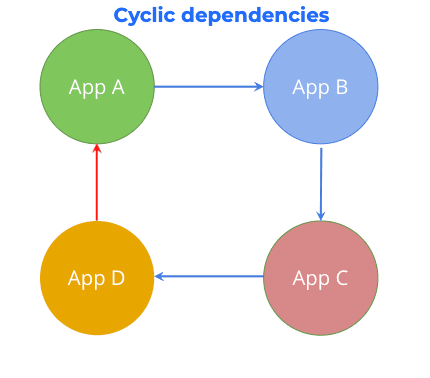 - Cyclic dependencies - Applications linked in such a way that they form a loop. ( A --> B --> C --> D --> A, here app D depends on app A, which creates a cycle)