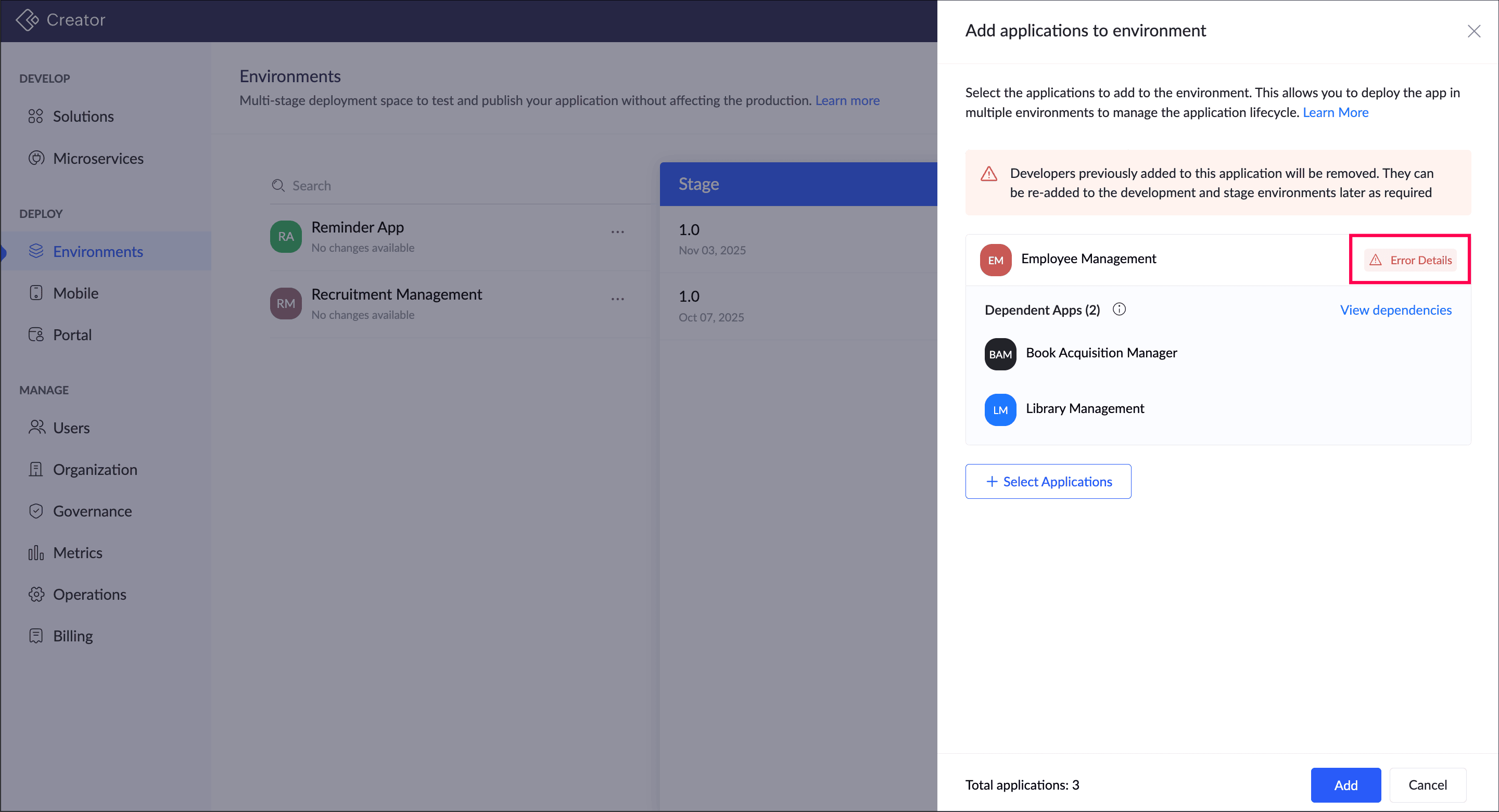Once all errors are resolved, the Error Details tag will be removed from the app. If other apps also have errors, follow the above steps and resolve all the errors. - Click the Add button. The applications will be added to the environments.