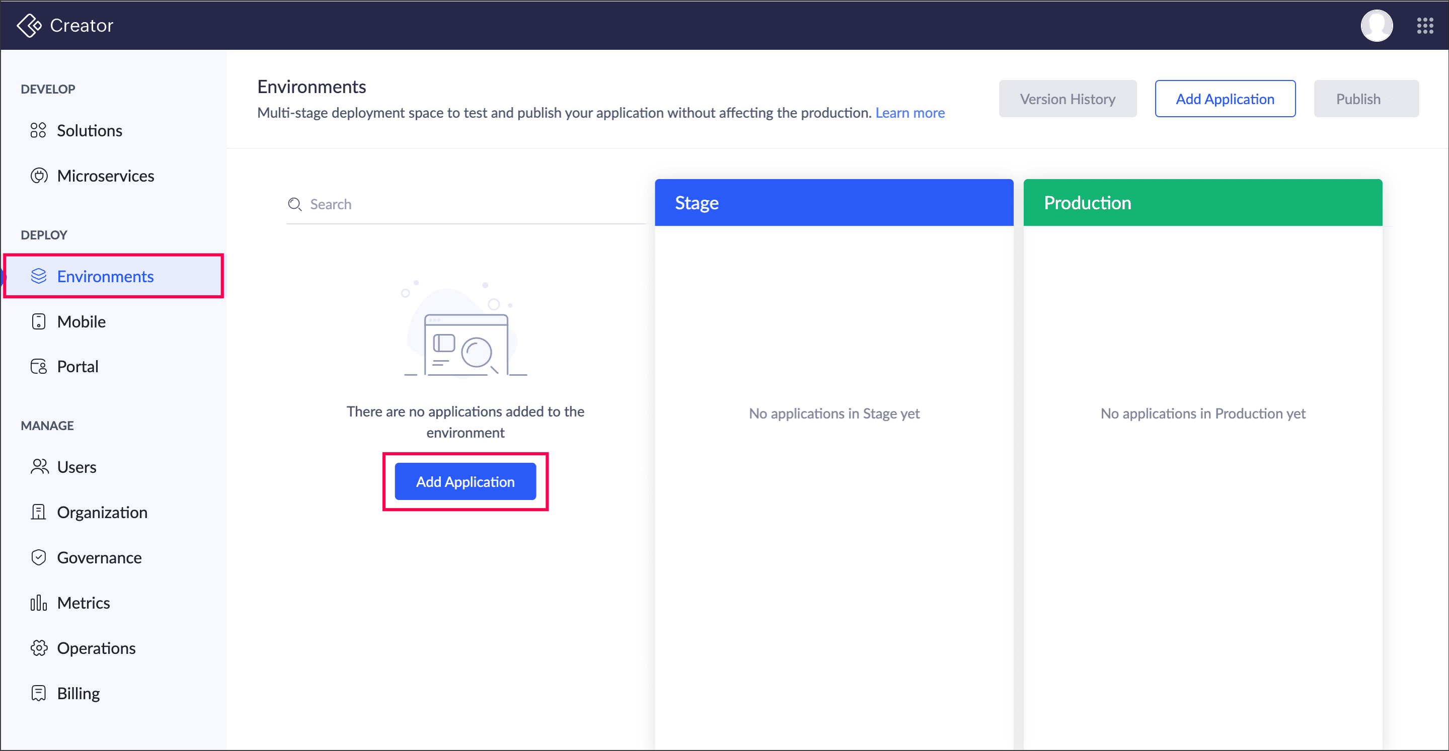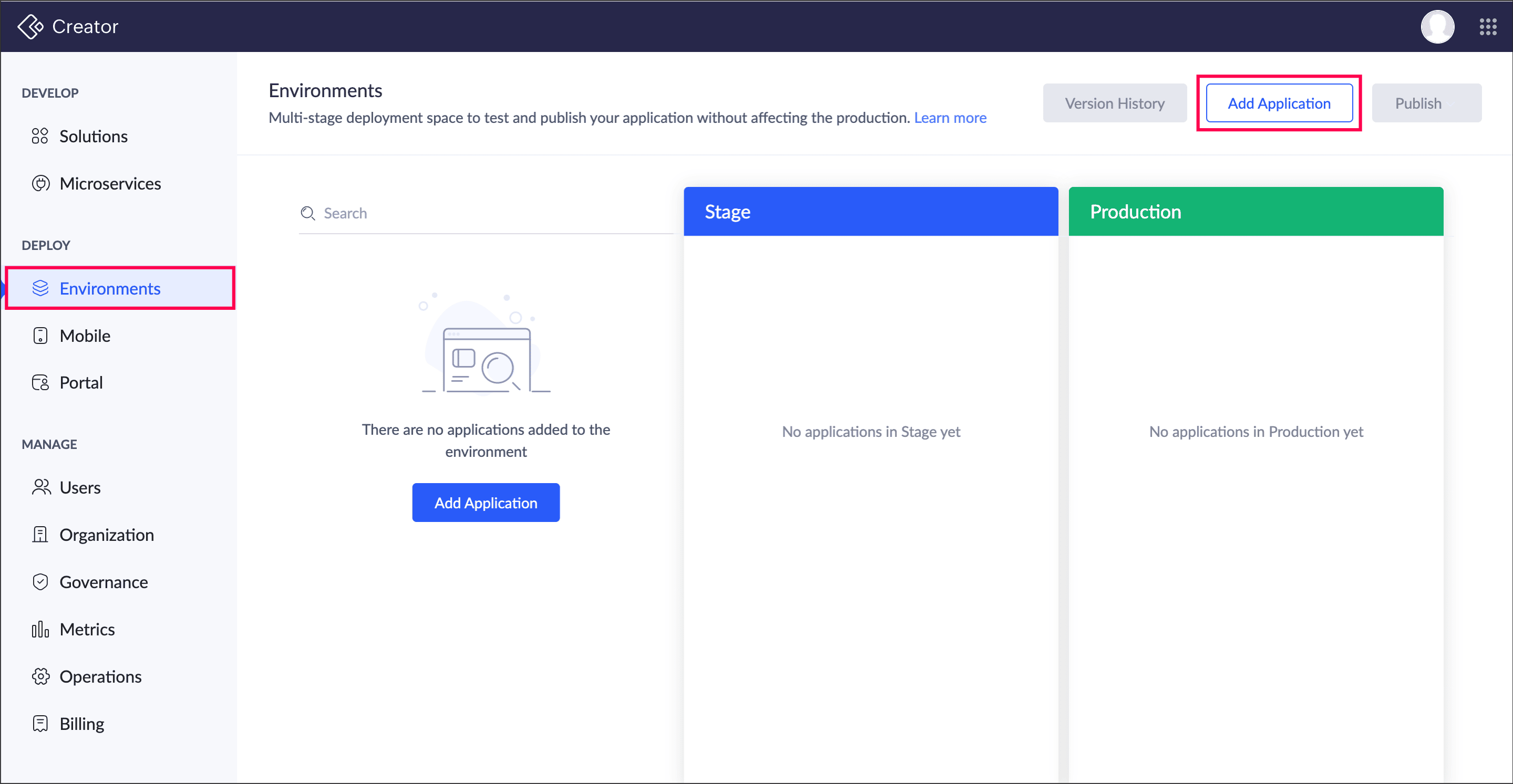 - Navigate to the Environments under the Deploy section and click the Add Application button.