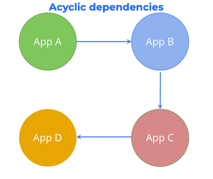- Acyclic dependencies - Applications linked in a linear relationship. (A --> B --> C --> D)