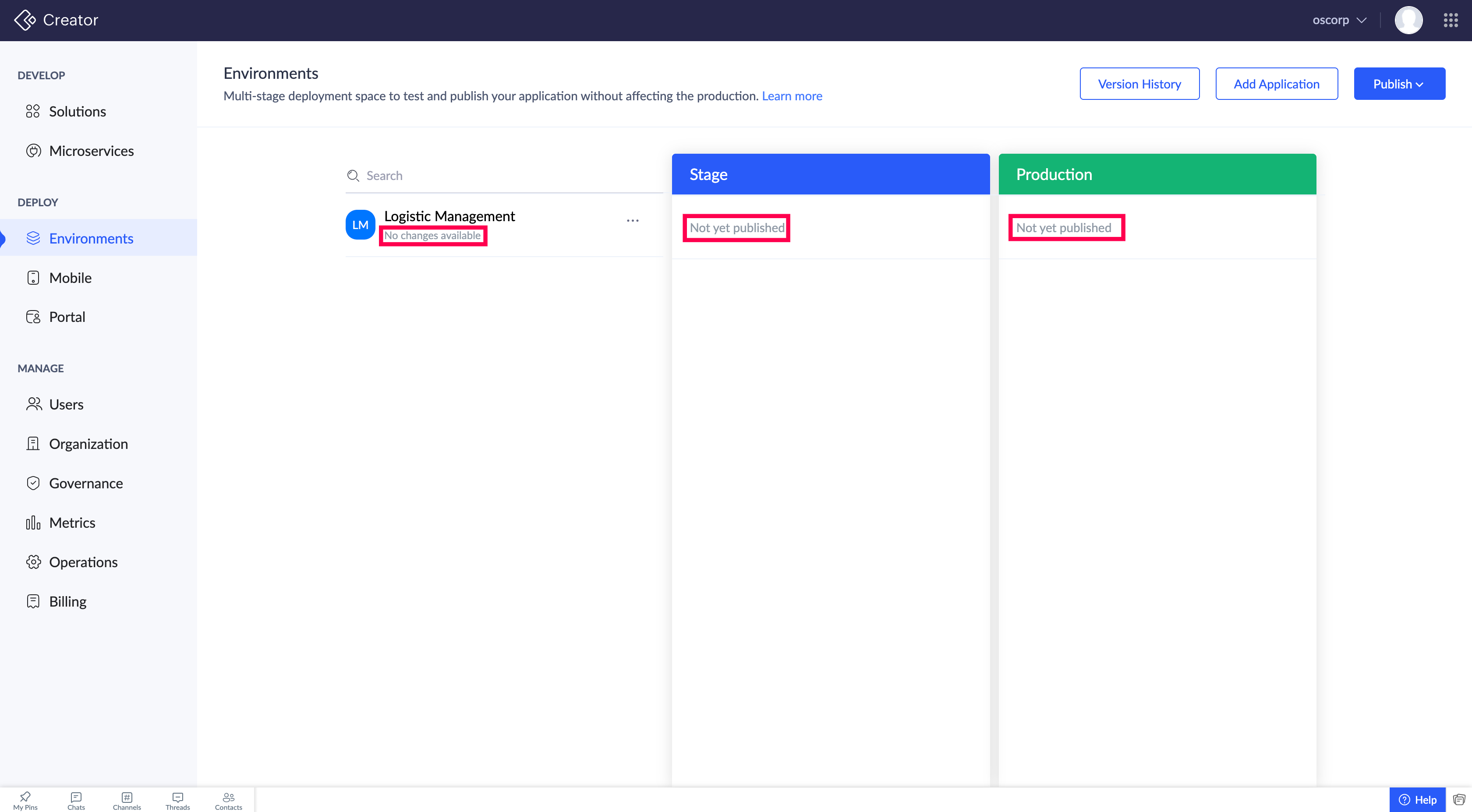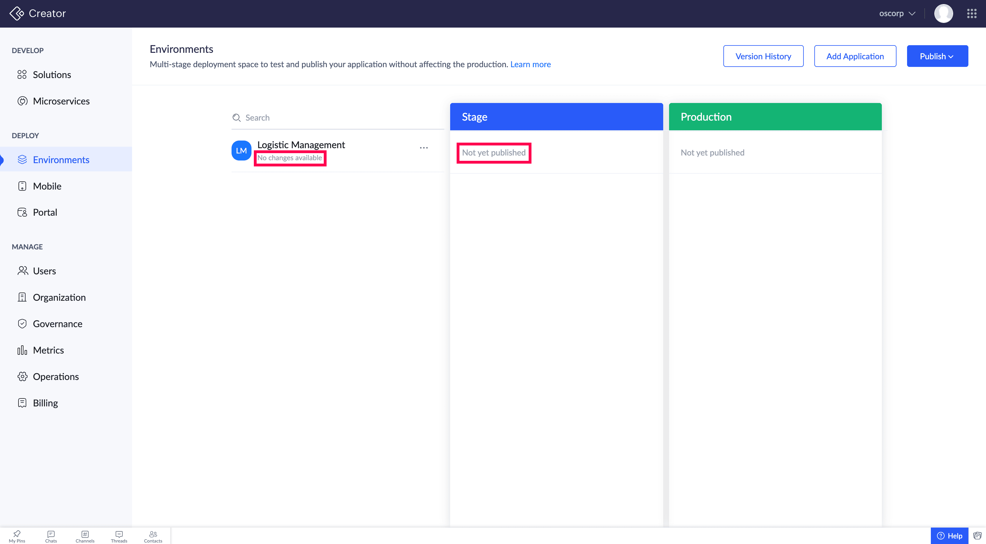 No changes available | The application has been successfully created in the development environment, and no modifications have been made after its creation, or all changes have already been published, and so there are no pending updates to publish. Only applications with changes can be published to the stage environment. Therefore, apps with this status cannot be published. |