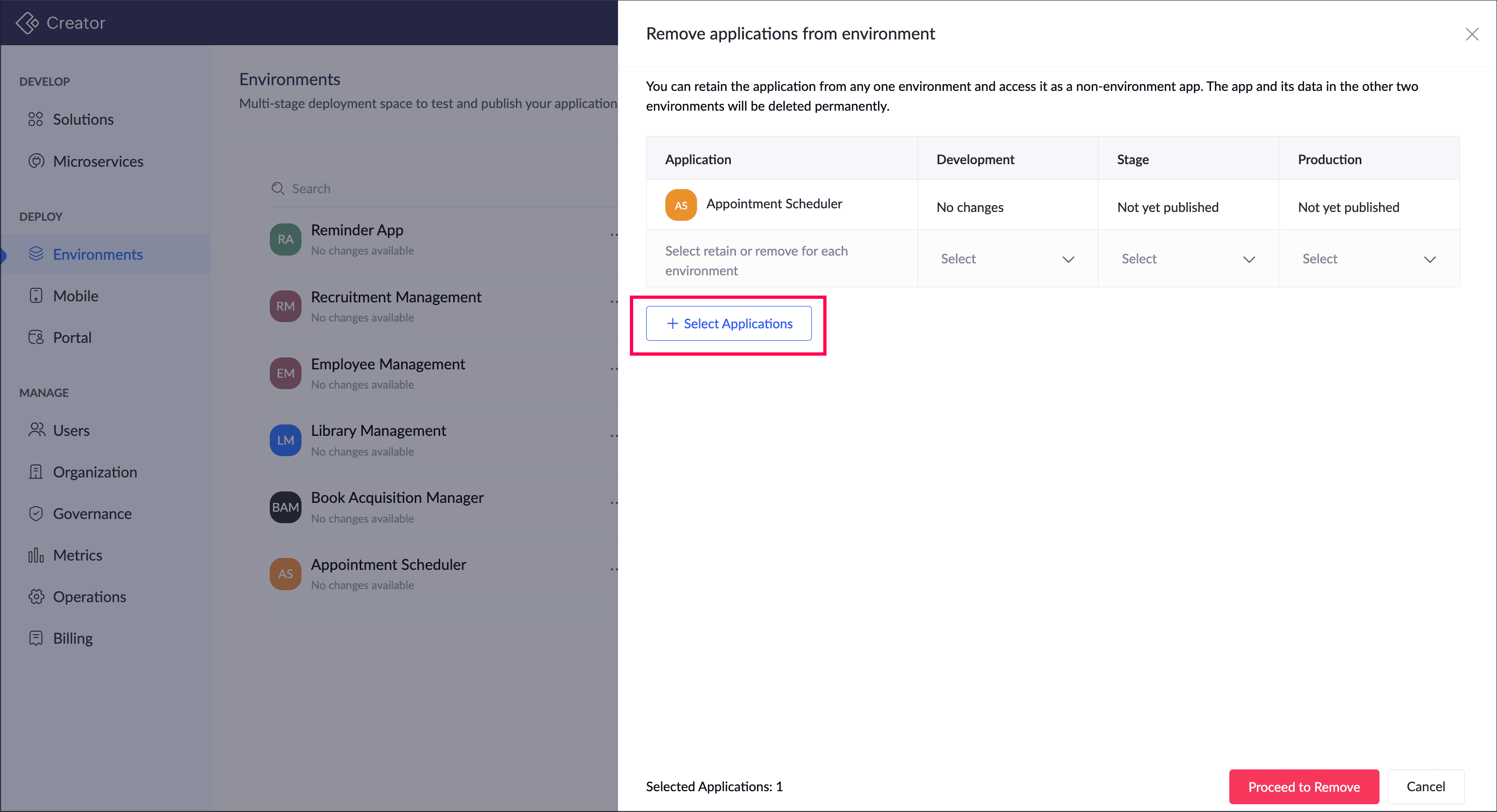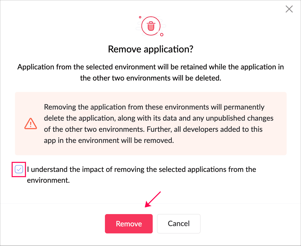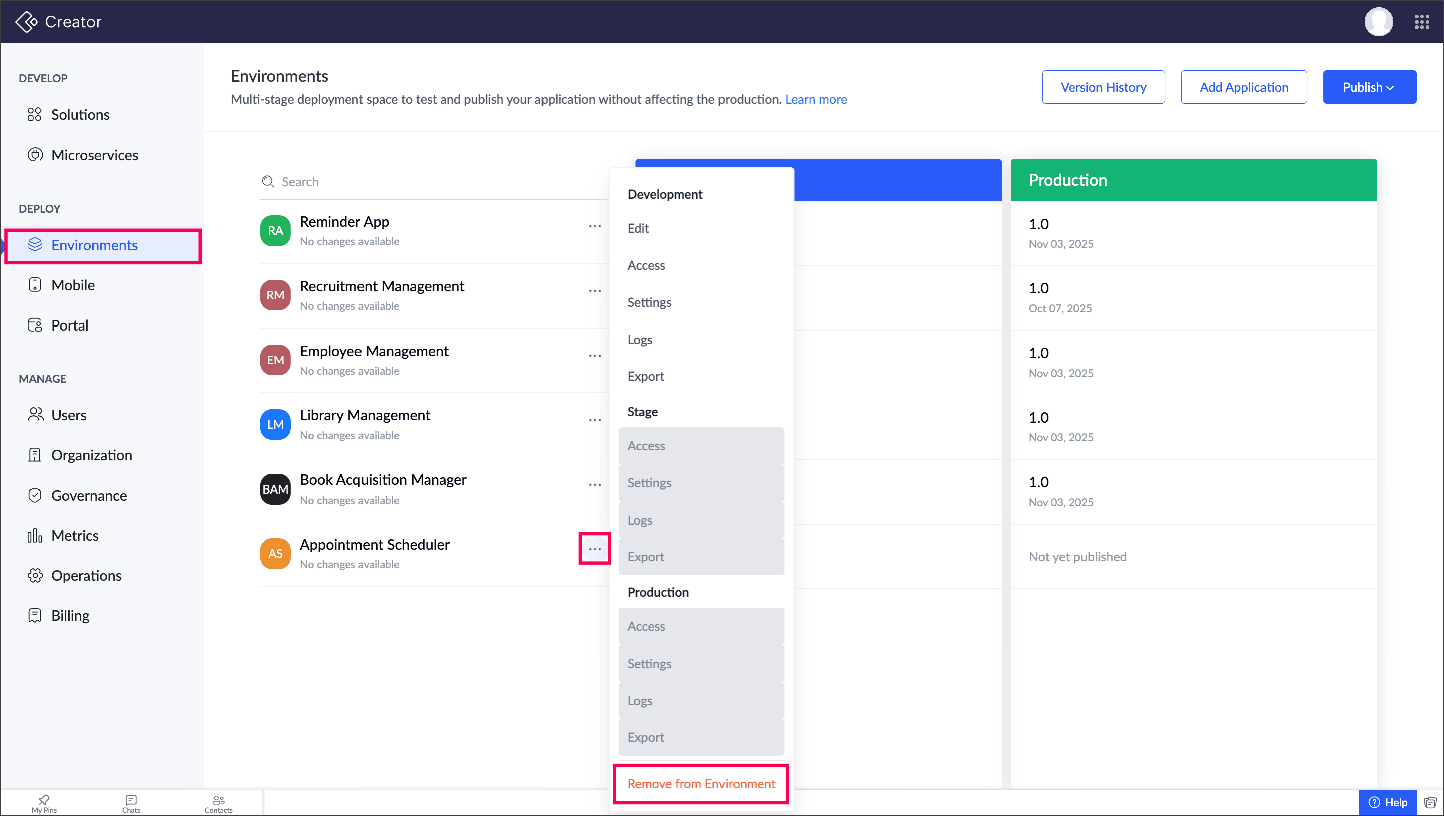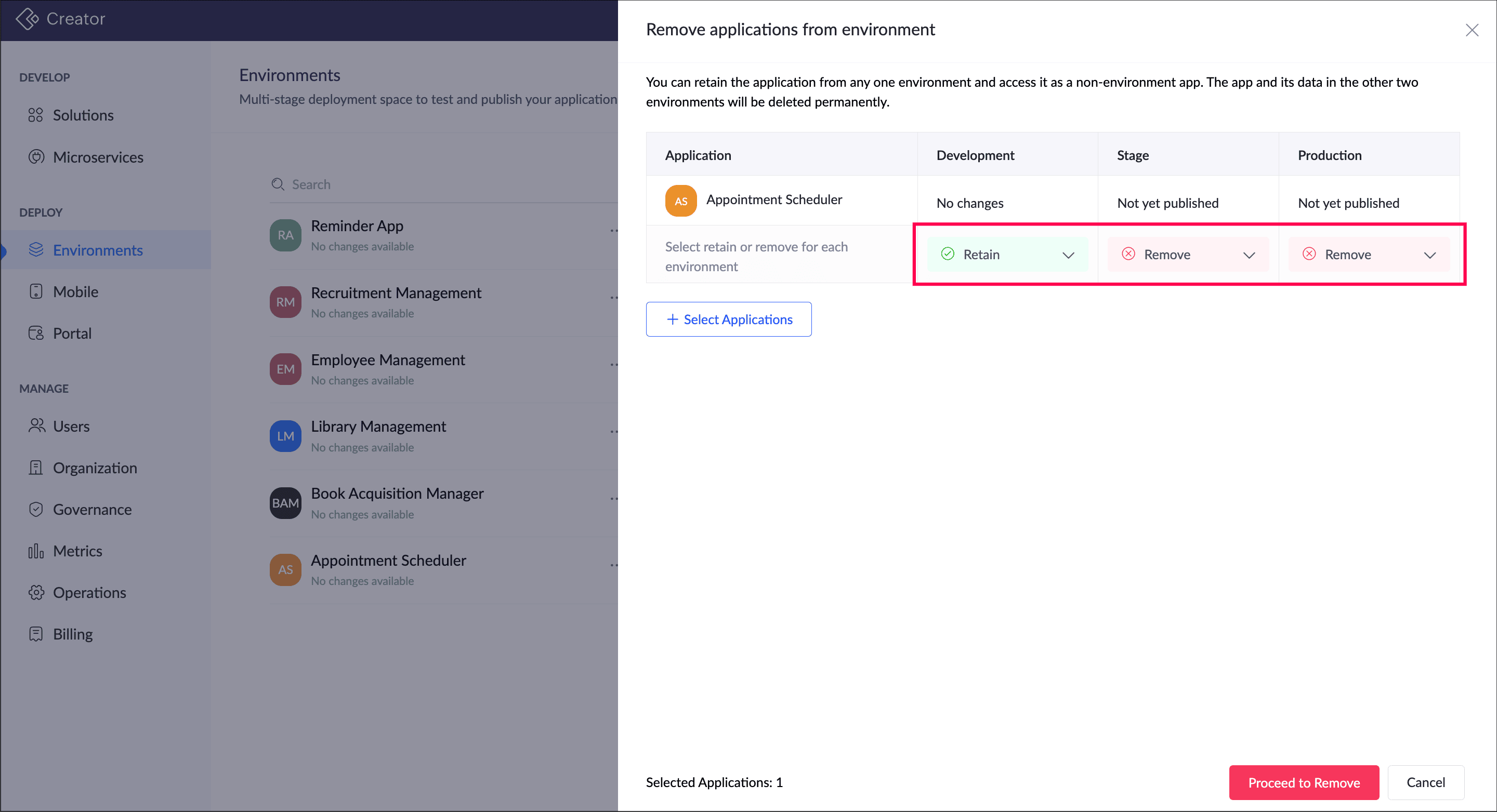 Note: Removing an application from the environment does not delete the application itself. Deleting an application permanently removes it from your Zoho Creator account, including all its data. In contrast, removing an application from an environment only disables the environment feature for that application, while the retained version of application remains intact.