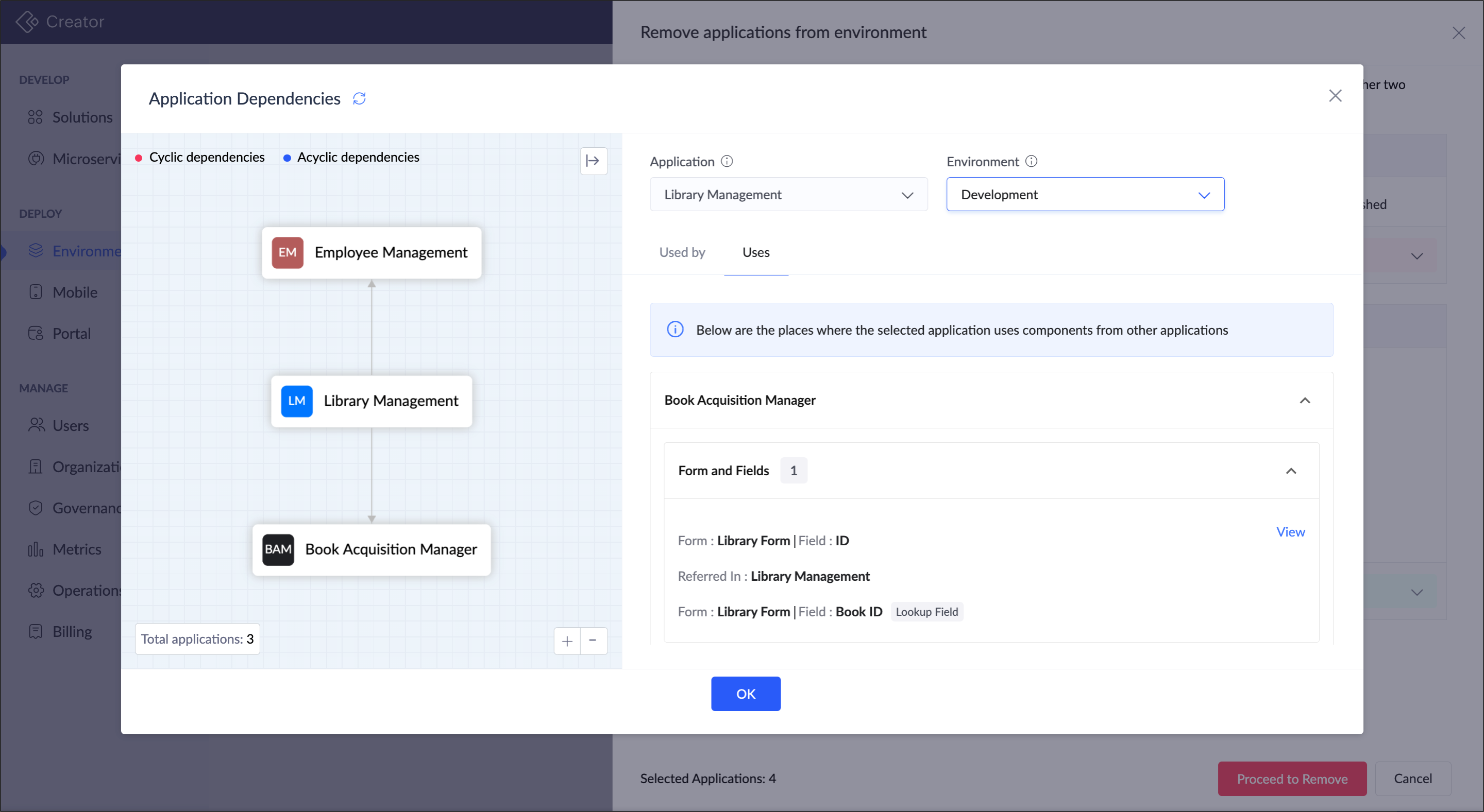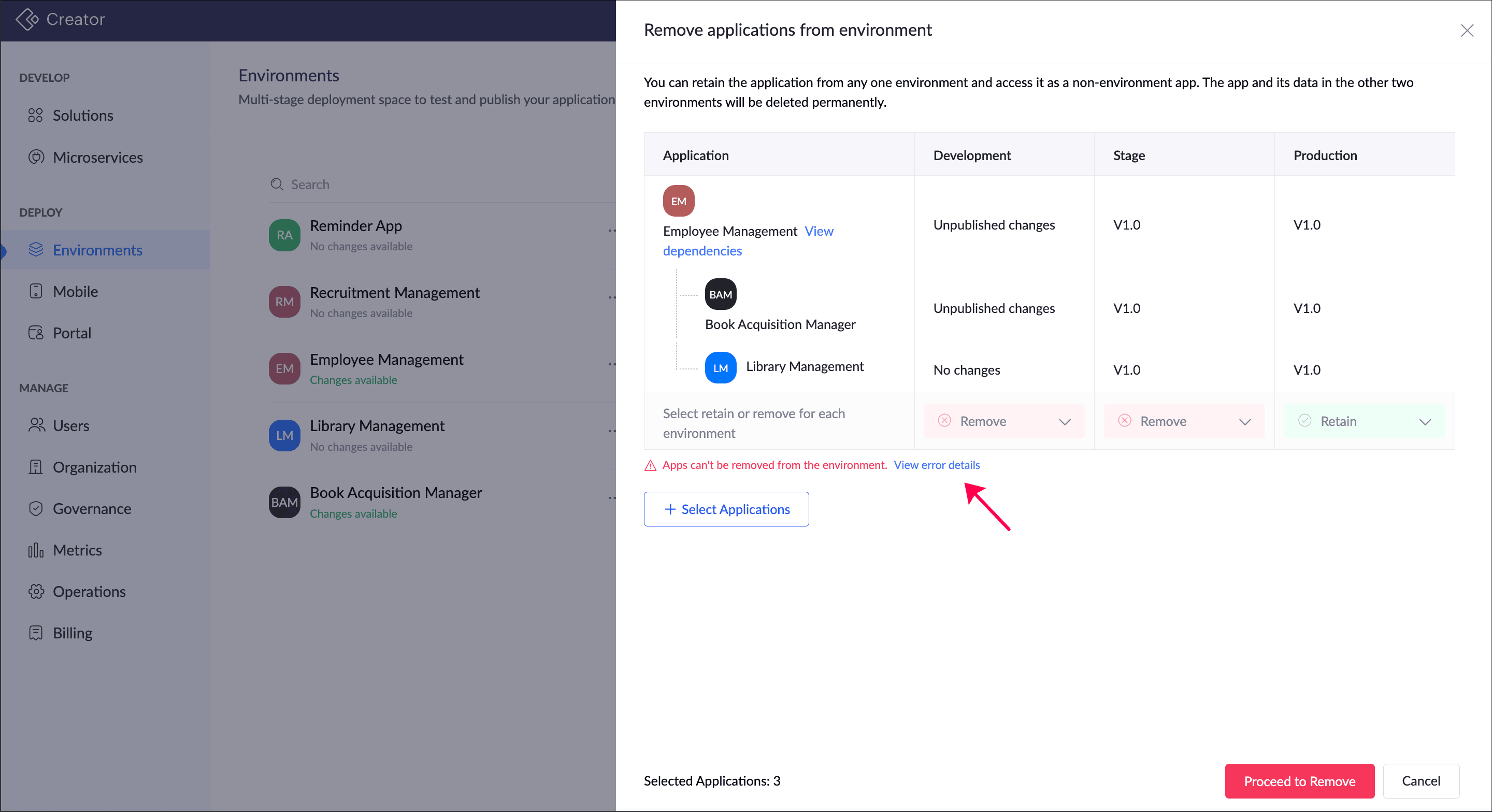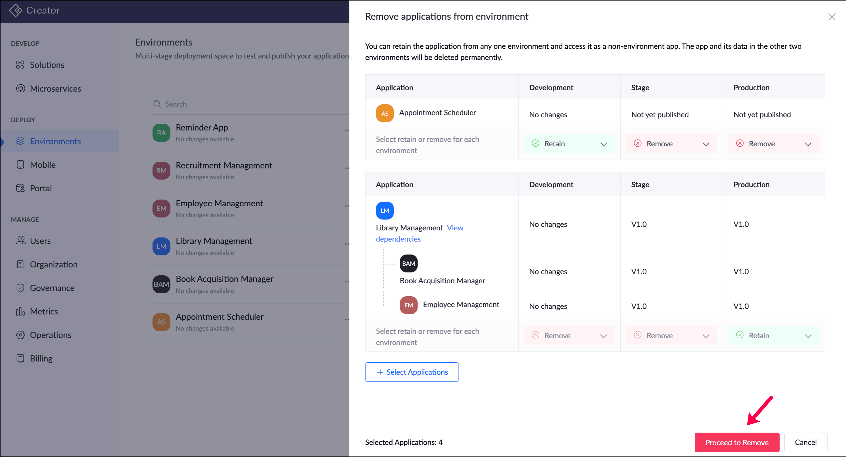 Note: Removing an application from the environment does not delete the application itself. Deleting an application permanently removes it from your Zoho Creator account, including all its data. In contrast, removing an application from an environment only disables the environment feature for that application, while the retained version of application remains intact.