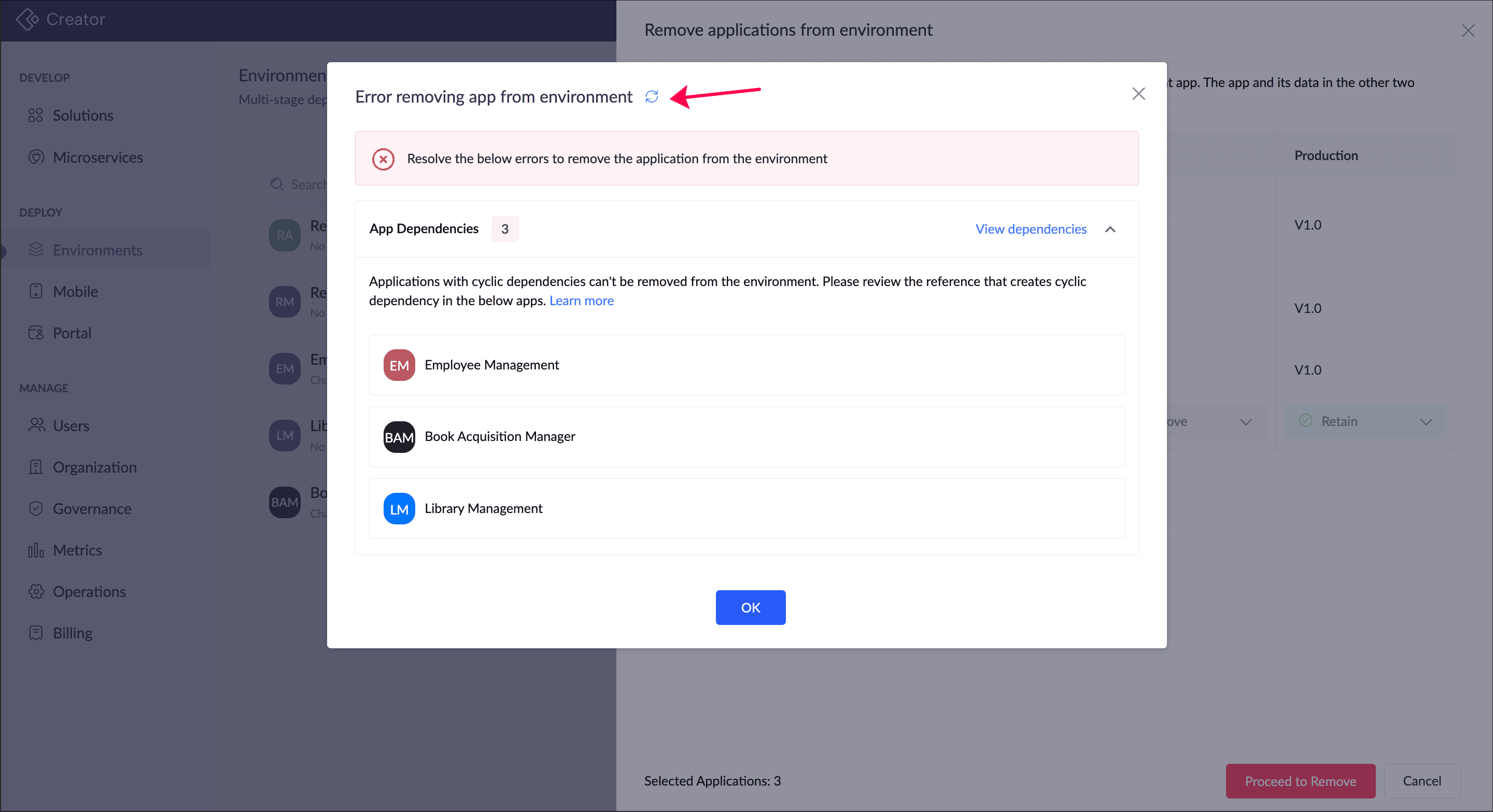 Info: If the application has been published in production, then only the production version of the application can be retained. Removing dependent apps from an environment