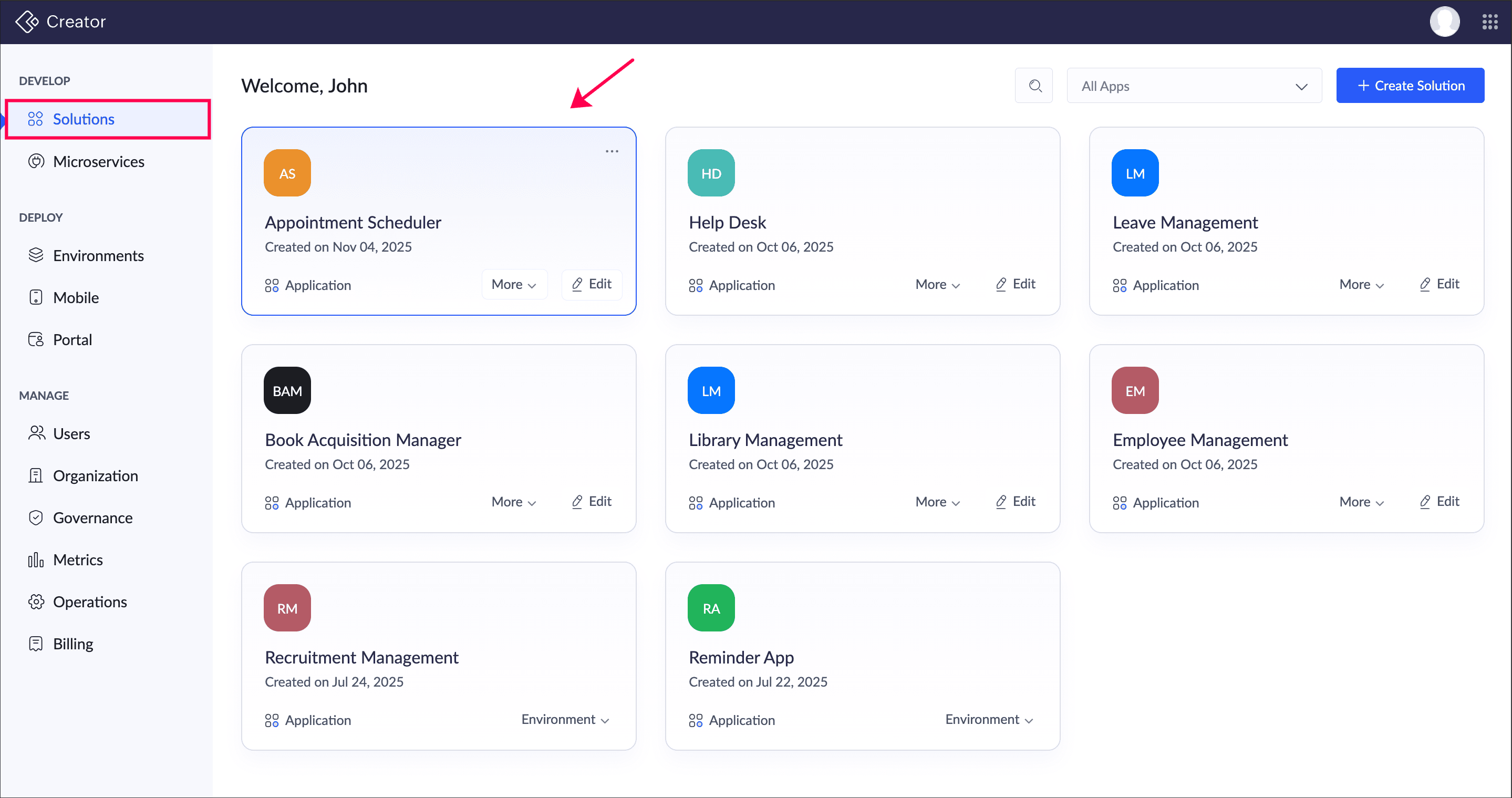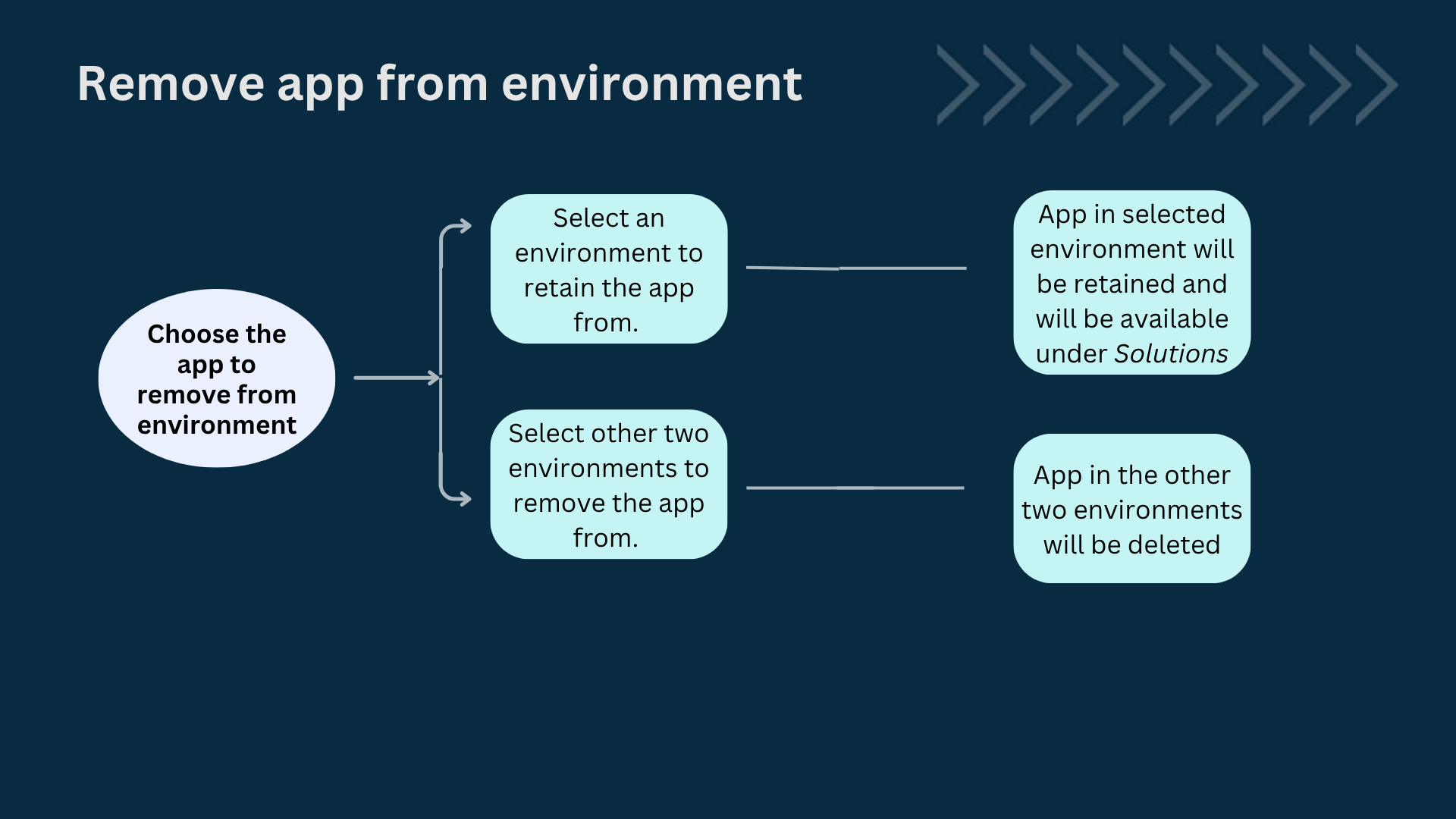 Removing an application from environments disables multi-stage deployment. It allows you to choose one environment from which the app and its data can be retained while deleting the app in the other two environments. The retained version acts as a production-only application. In other words, this process converts an environment-enabled application into a standalone production application, which can be accessed from the Solutions page.