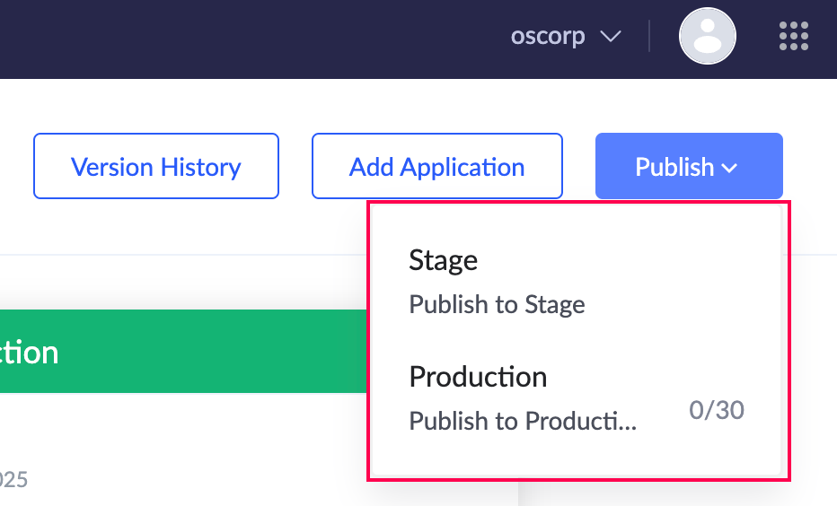 - Production panel: Displays the version number and the date of the latest publish of the application if it has been published to the production environment. This version is live and accessible to users.