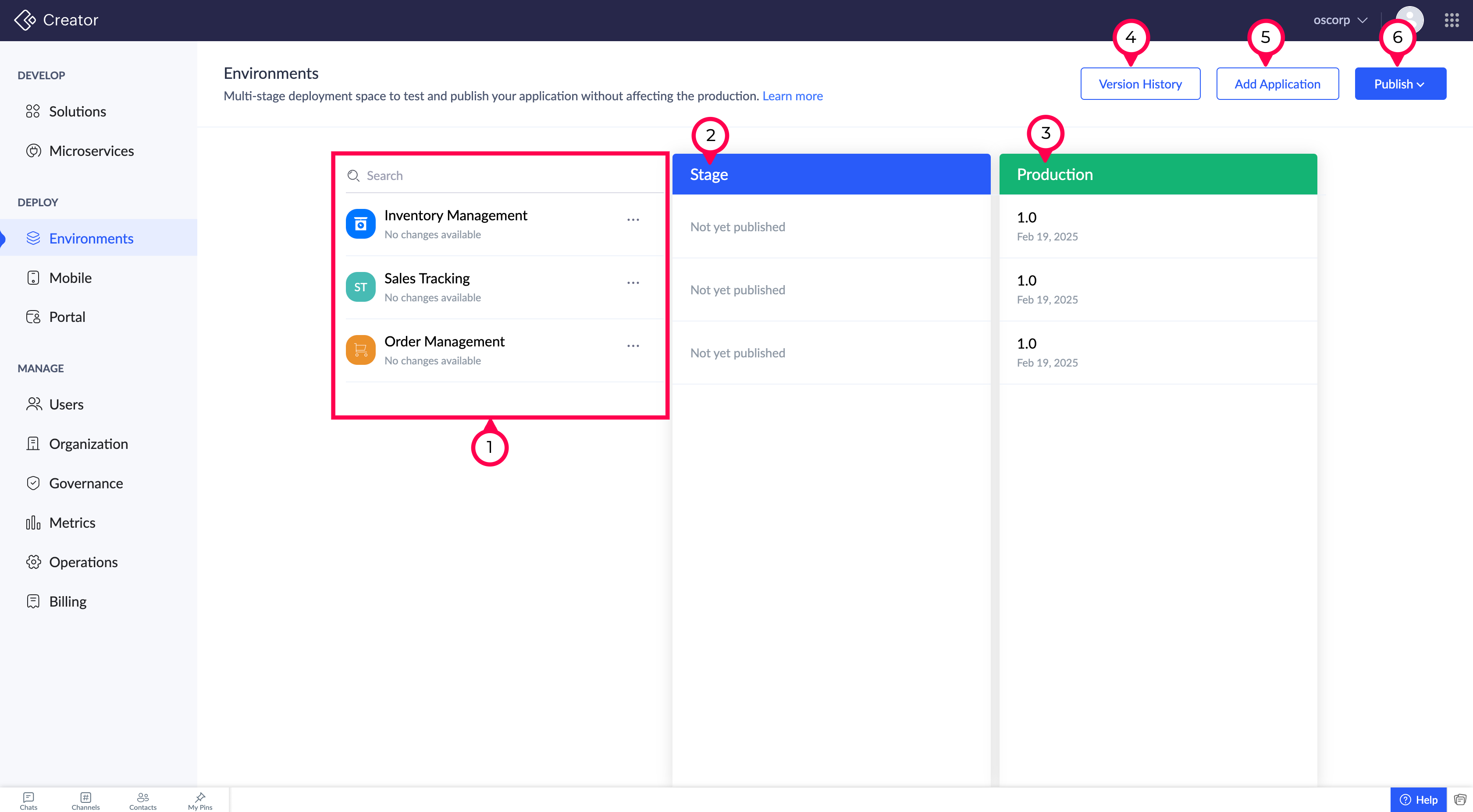 To access environments, click Environments under the DEPLOY section from the left pane of your Creator dashboard