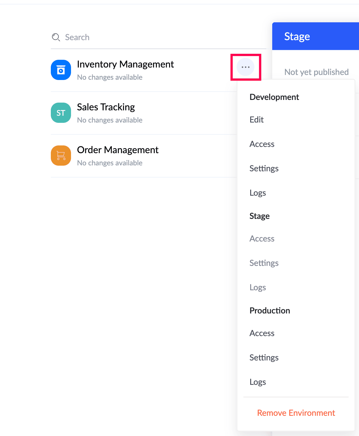 The horizontal ellipsis menu that is adjacent to each application lets you manage the app-specific configurations in each of the three environments, as shown below.