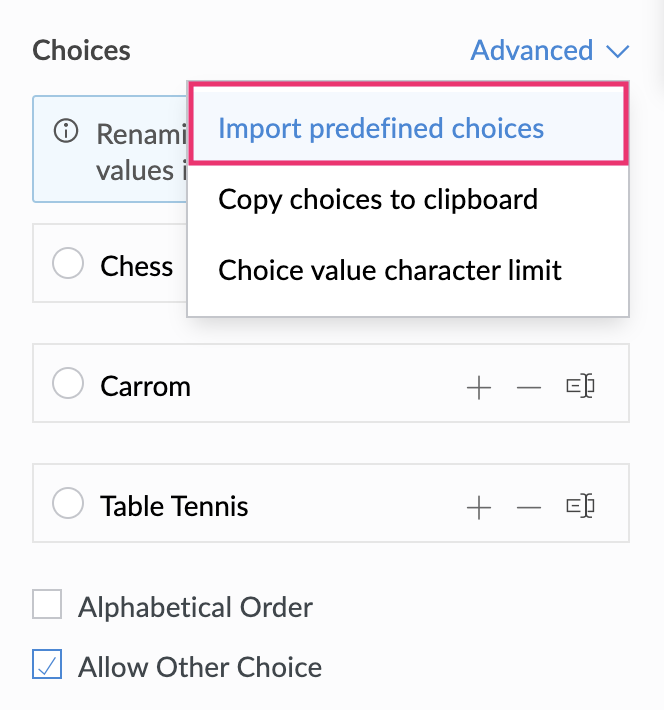 - Click Advanced and choose Import Predefined Choices. In the pop-up window that appears: