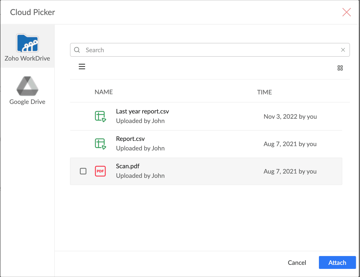 - Zoho WorkDrive enables your users to upload a file from their Zoho WorkDrive