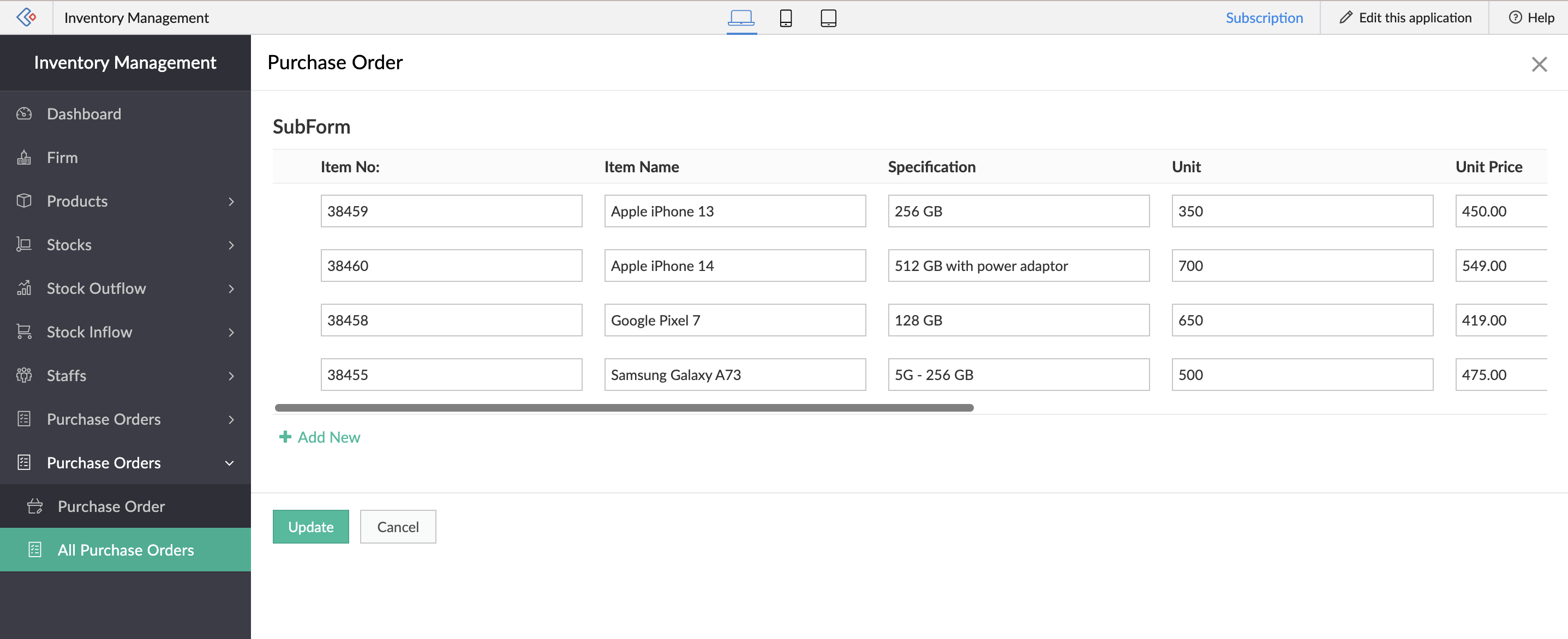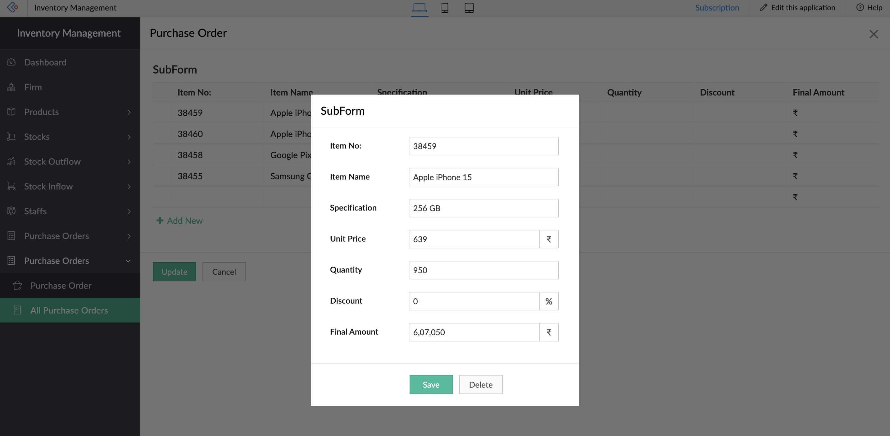 Let's assume you have built a Zylker Inventory Management application that is used to streamline your business by efficiently maintaining and managing inventories from raw materials to finished products. There is an in-house Purchase Order form that enables you to place orders for required materials. This form includes a subform named Product Items that allows you to add rows of product details that you require. This subform has fields named Item No, Item Name, Specification, Unit, Quantity, Unit Price, Preferential Amount, Discount, Final Amount, and Note. It might be tedious for you or your users to scroll horizontally every time they add a row in your subform. You can choose the view type for your subform as List View. Now, when your users try to add a new row of data, it will open a popup subform where fields will be listed vertically.