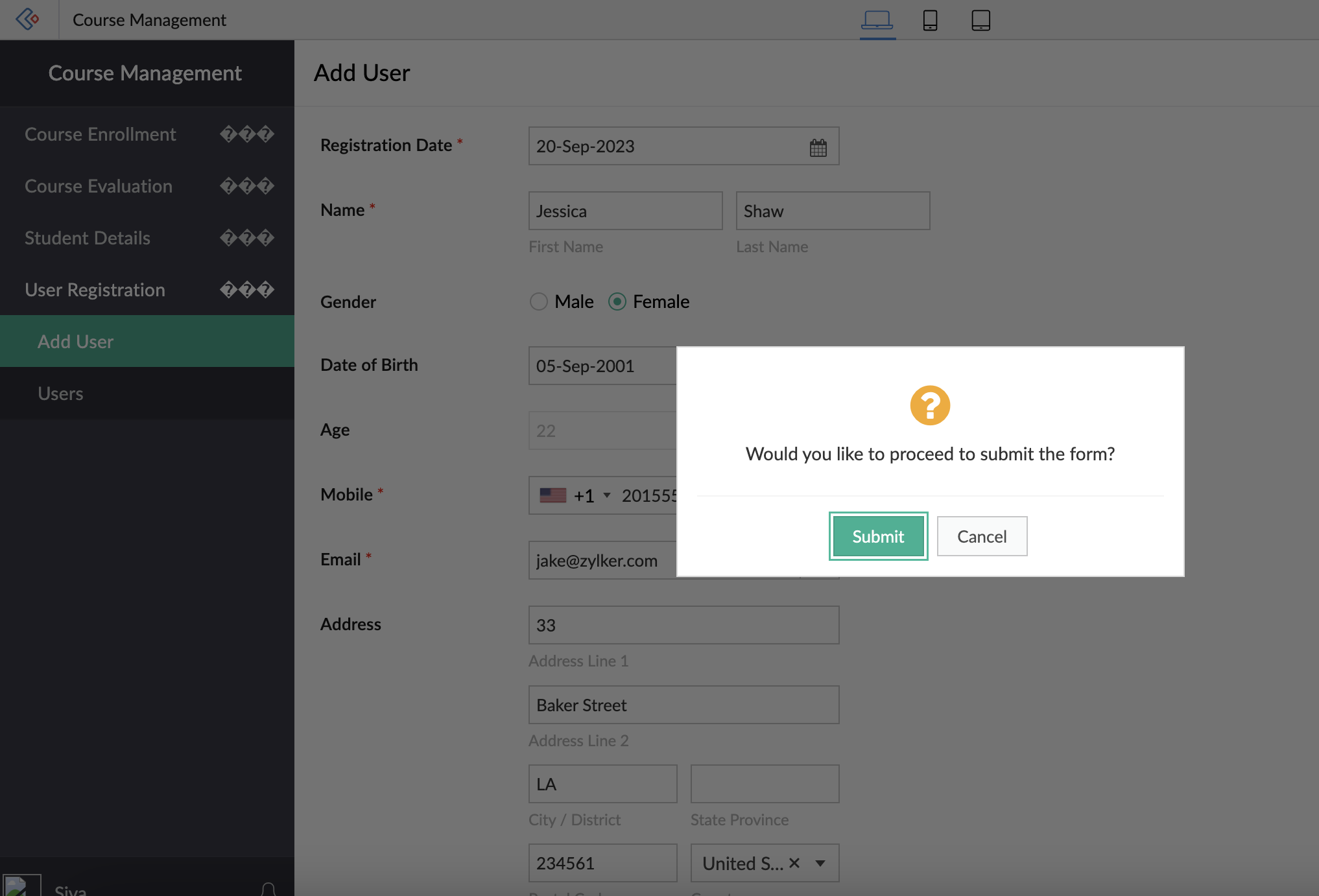 Let's assume that you've created a Creator application named Course Management. In this application, the Course Payments form collects payment details for courses. Upon clicking Submit, this form redirects to the configured payment gateway's page. To ensure that users don't unintentionally complete a purchase, you can enable the Confirm Form Submission property that displays a popup when the Enter/Return key is clicked. This ensures that the user actually intends to move forward with form submission and its subsequent actions (such as opening a payment gateway upon form submission), thereby also contributing to a more positive and user-friendly experience.