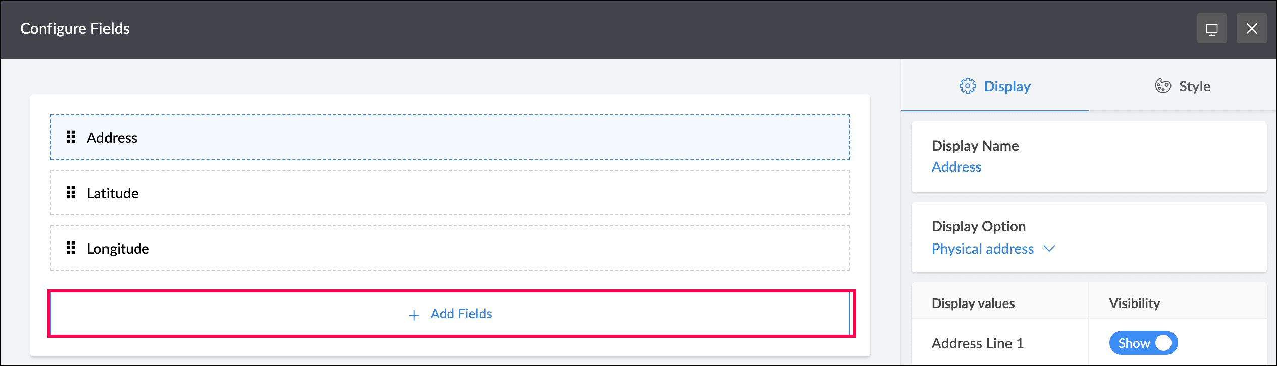 - A pane will slide in from the right, showing all the fields displayed to users. Select Add Fields.