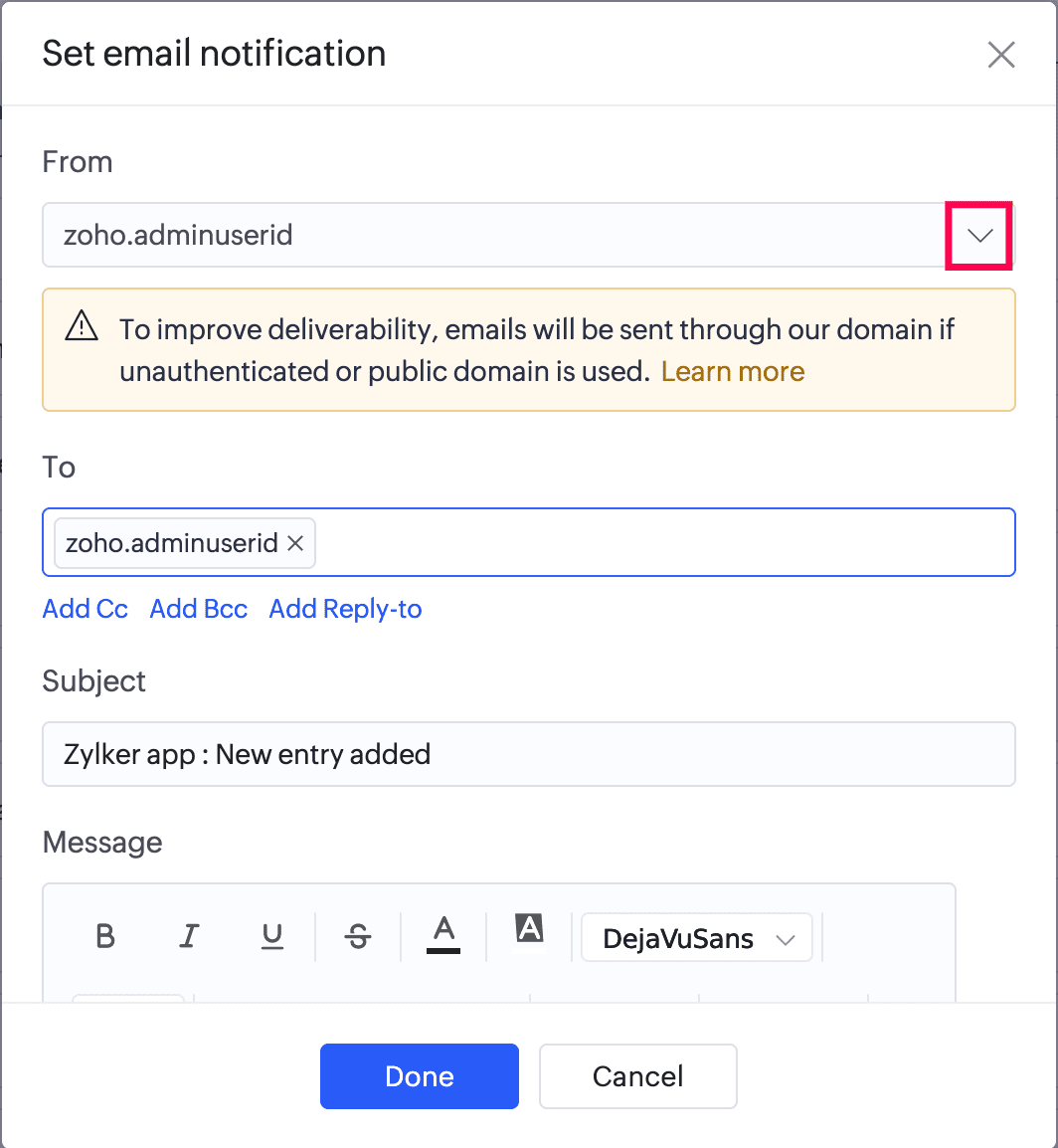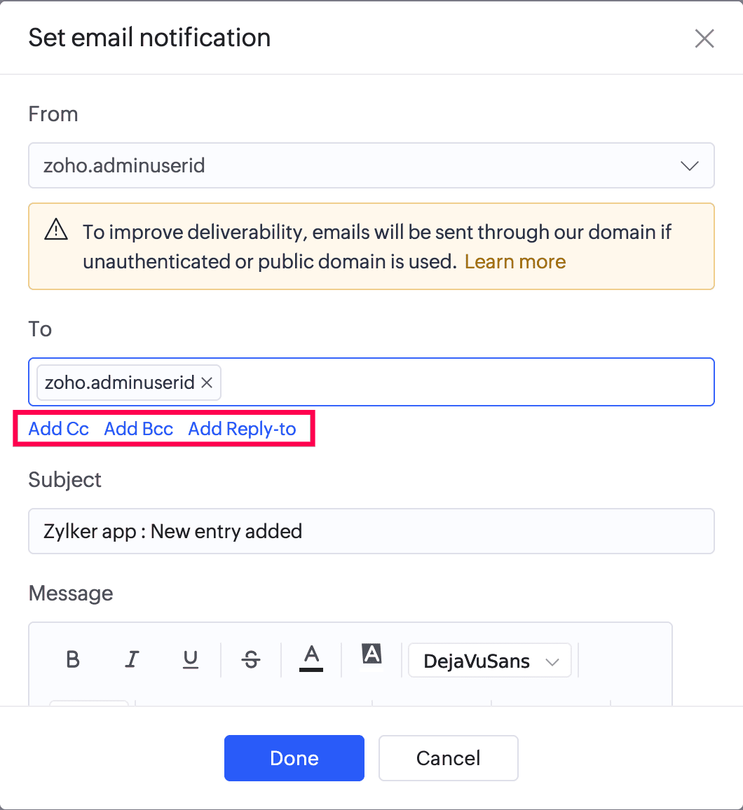 Click Add Cc , Add Bcc , and Add Reply-to to add Cc, Bcc and Reply-to email addresses. These are optional. You can set them with any of the following: