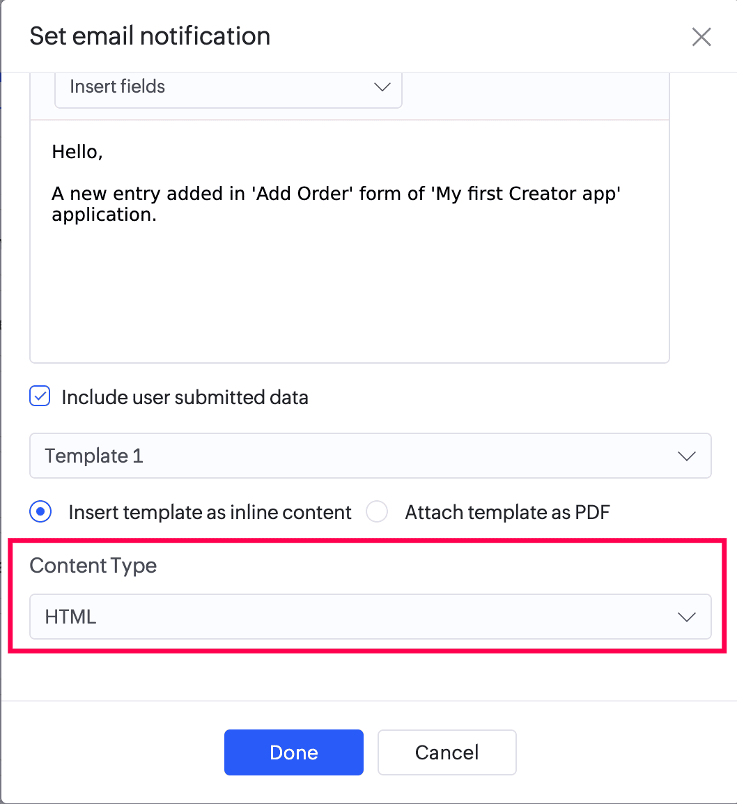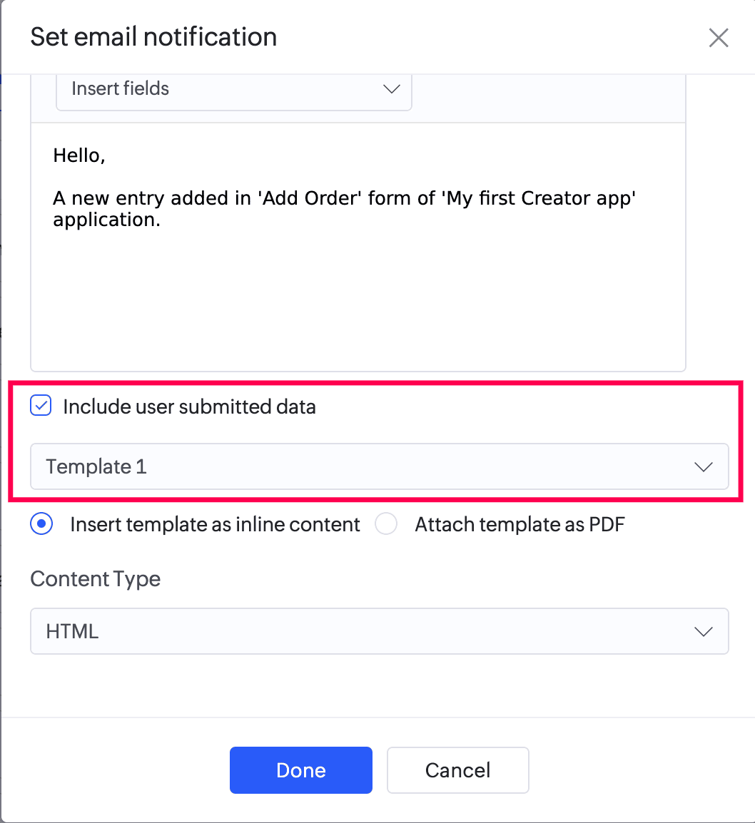 - Check the checkbox next to Include user submitted data , then select the required form template (the Default Template is selected by default). This will enable you to include (in the email) the data your users submit (through your form) in a custom format (as defined in the selected form template).