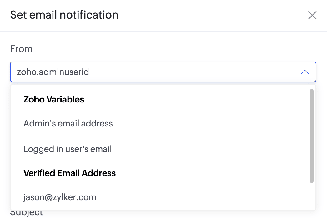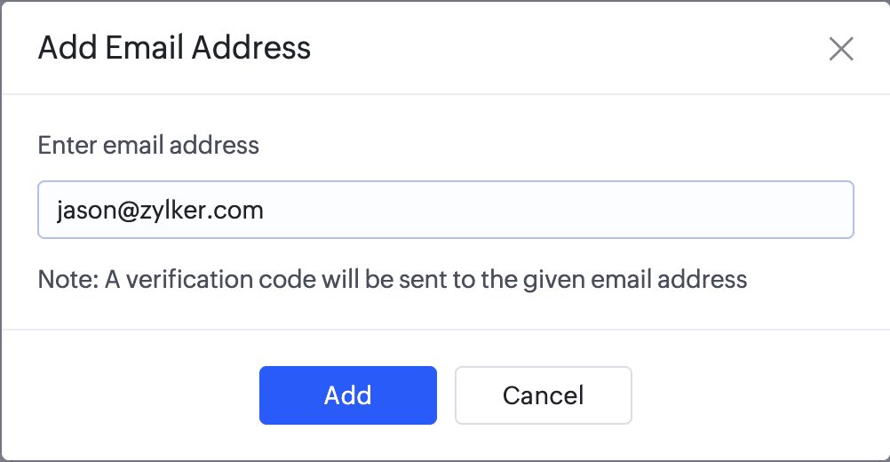 Enter the required email address, then click Add . A verification code will be sent to this address by noreply@zohocreator.com .