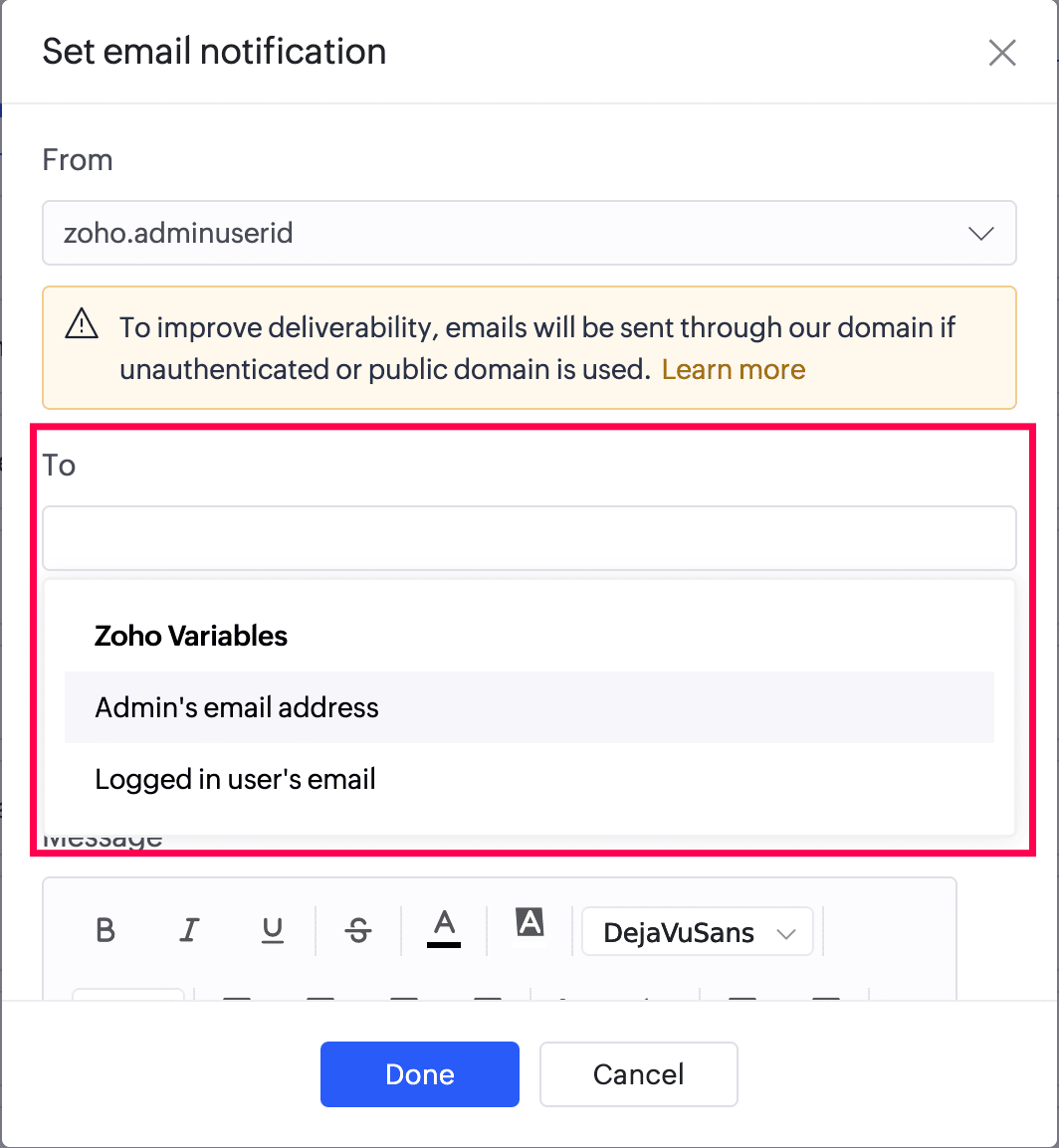 - Set the email's Message as required. It can contain rich text and refer to the data your users enter in your form's fields.