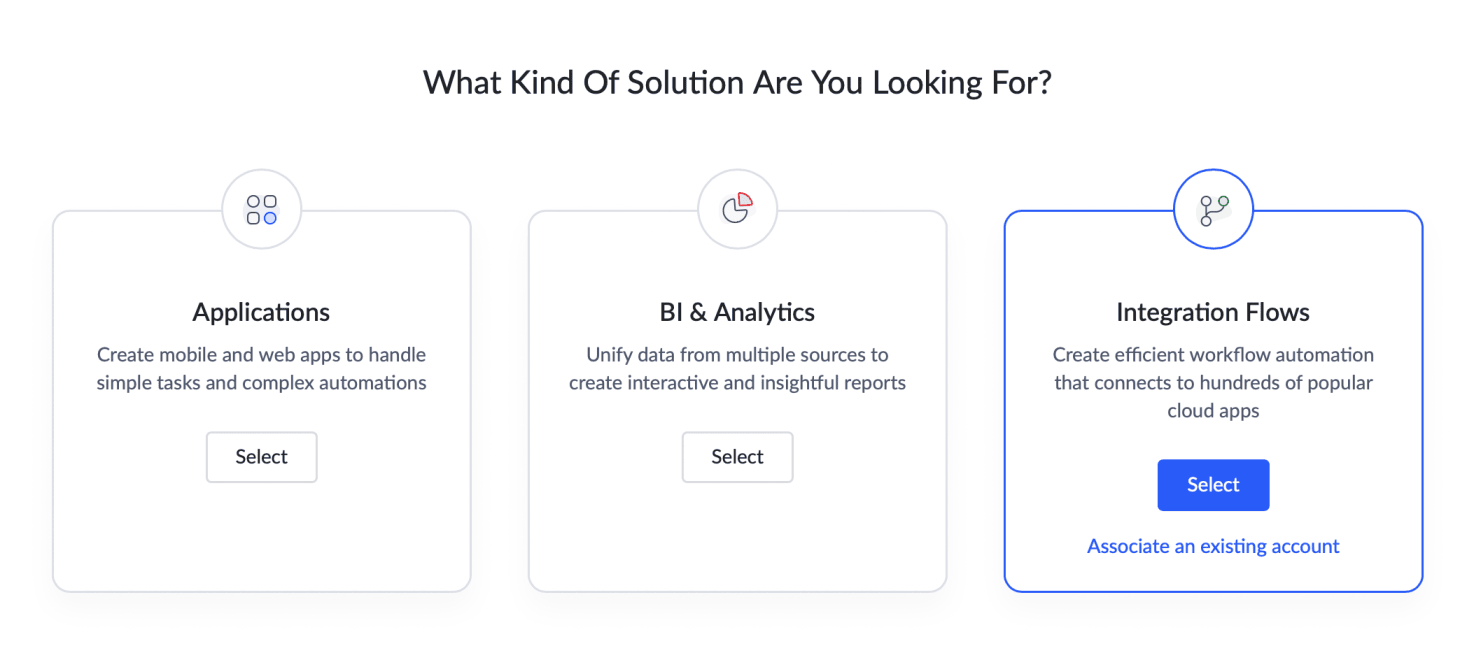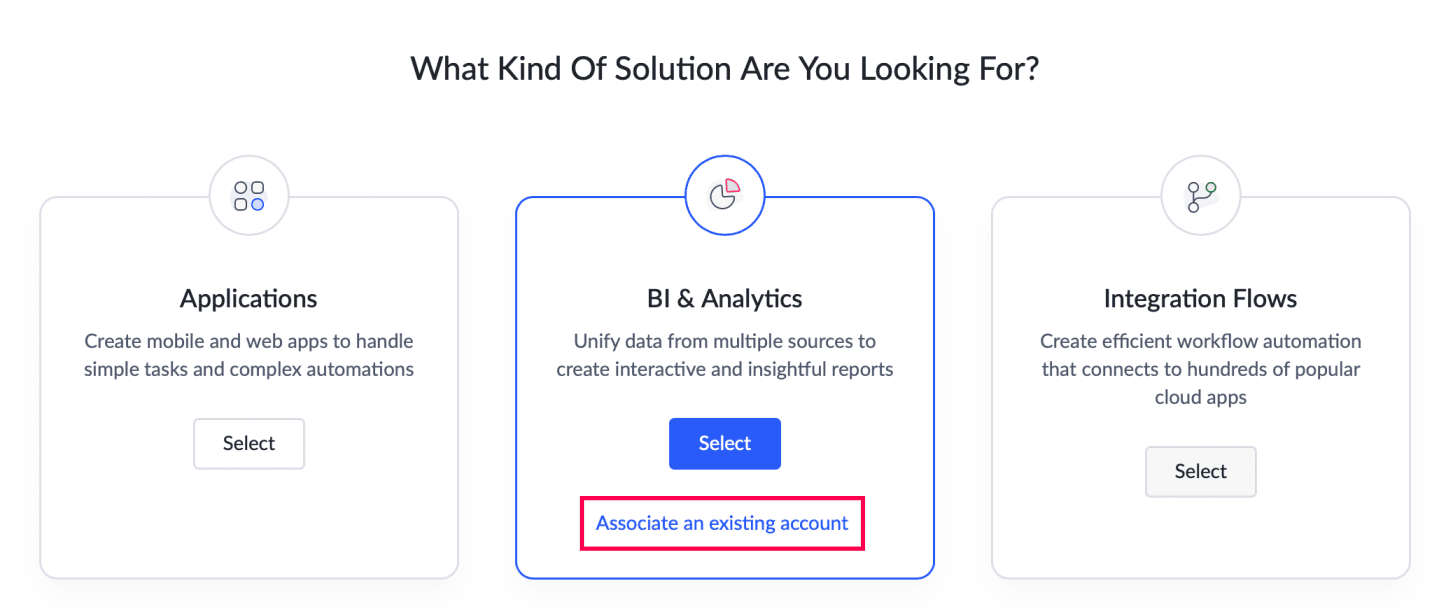 Users who have created a Zoho Analytics or a Zoho Flow account separately, can associate their Analytics or Flow accounts with Creator to access everything from the Creator account dashboard.