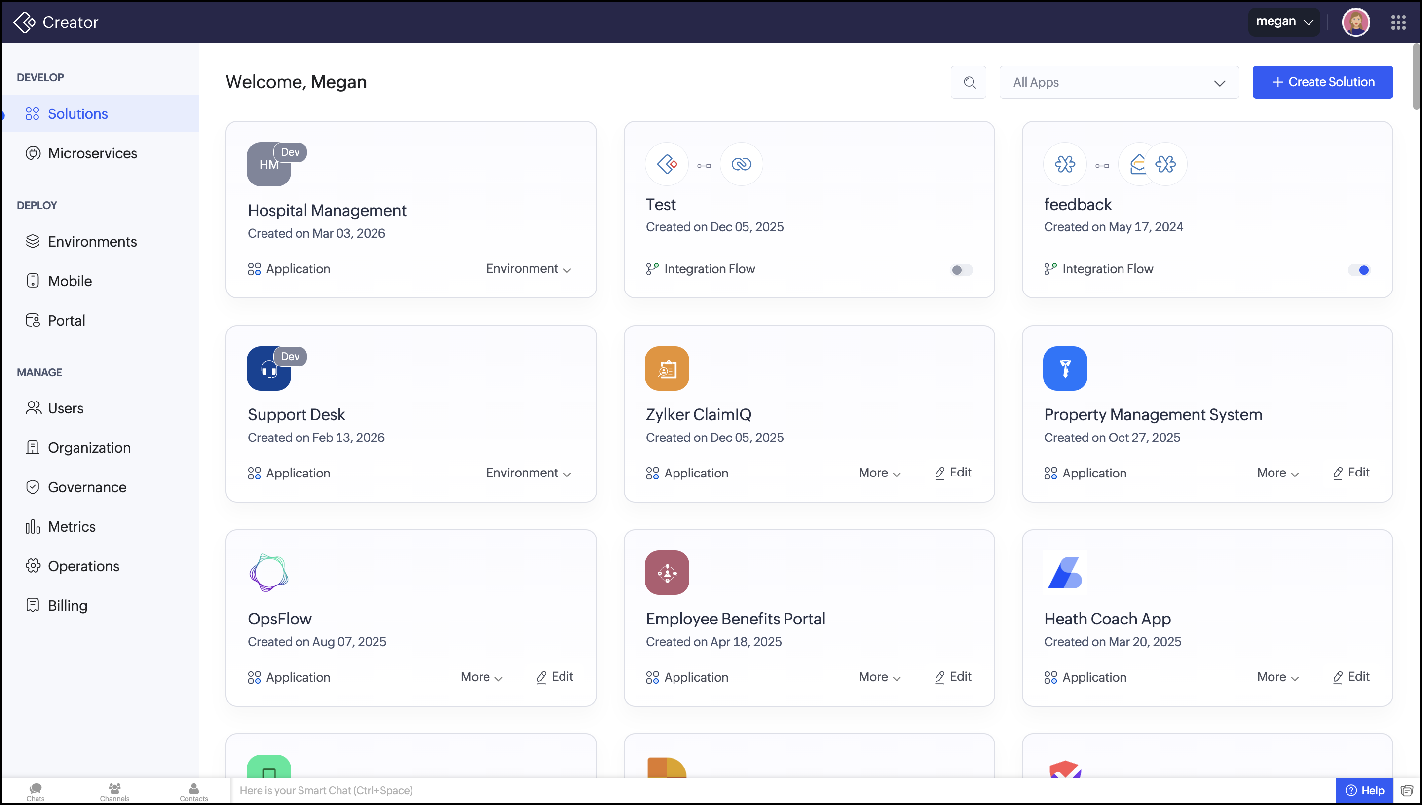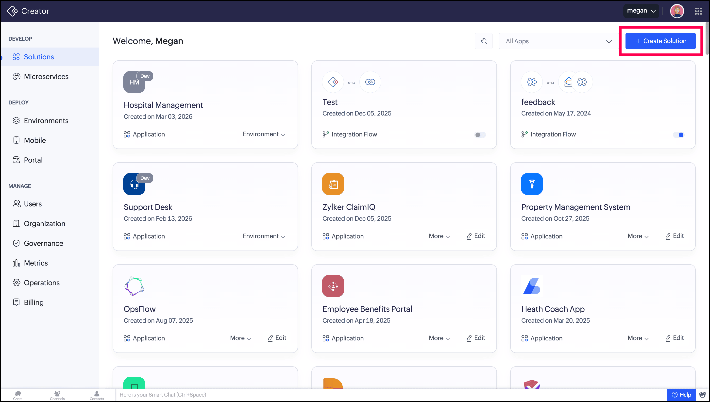 - In your Creator homepage, either Applications or Solutions will be shown based on your pricing plan. Users on the Enterprise plan will see Solutions, while users on other plans will see Applications.