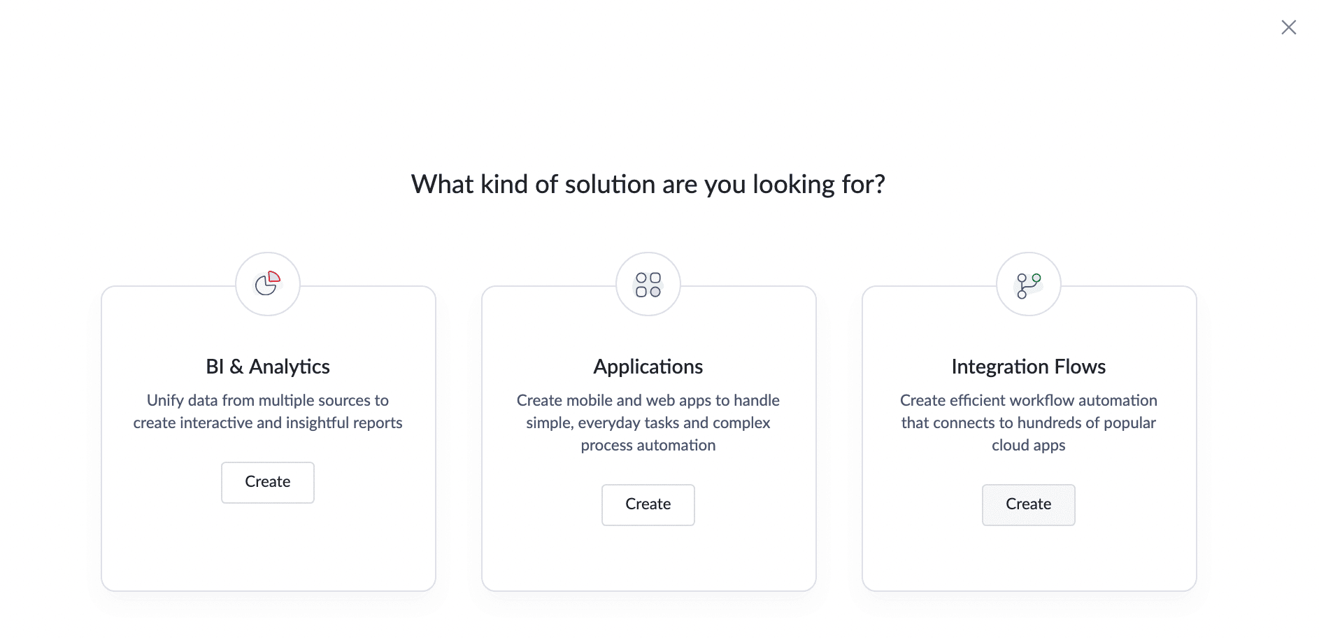 On your Creator homepage, click the Create Solution button at the top-right corner in the Solutions module. Three kinds of solutions will be displayed.