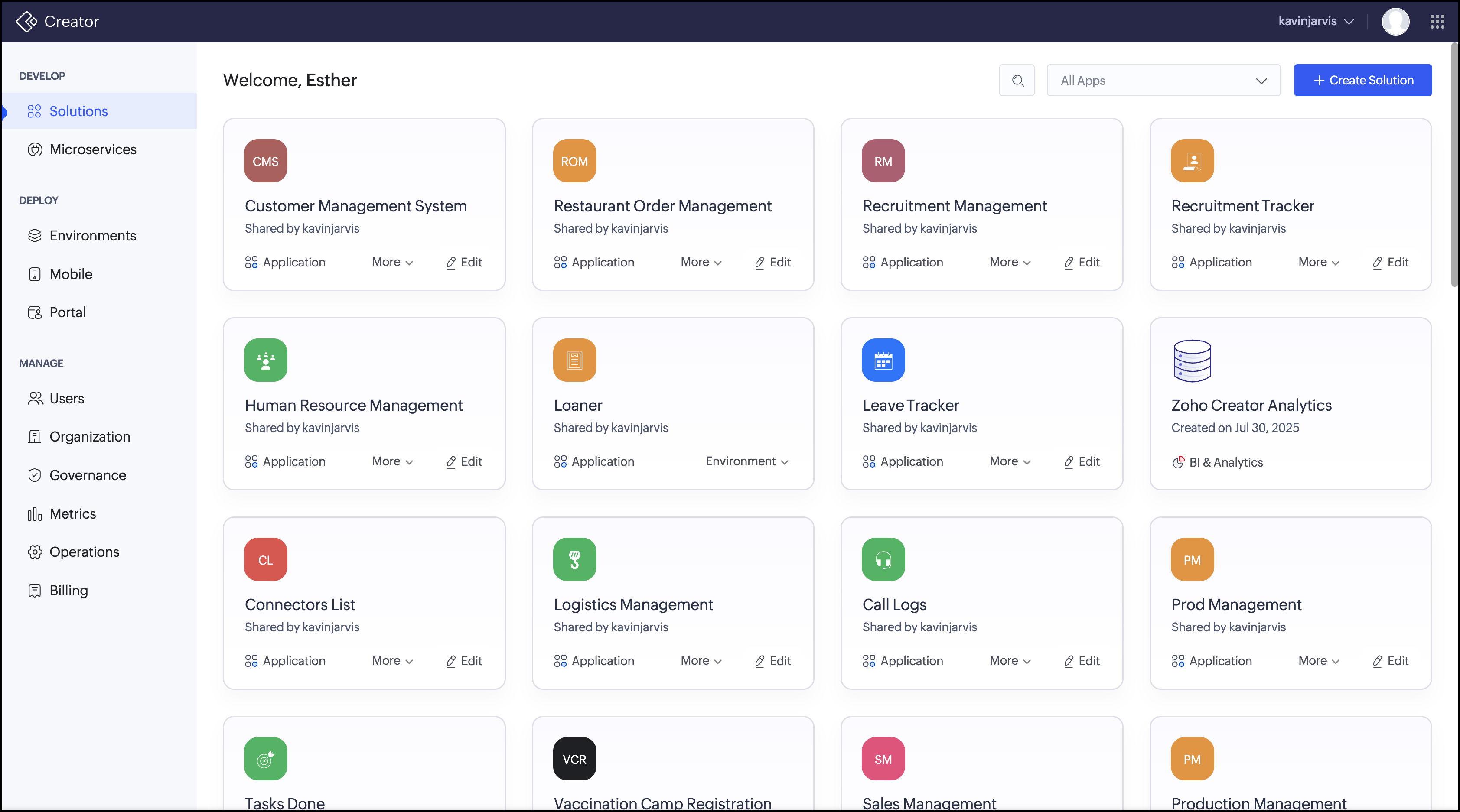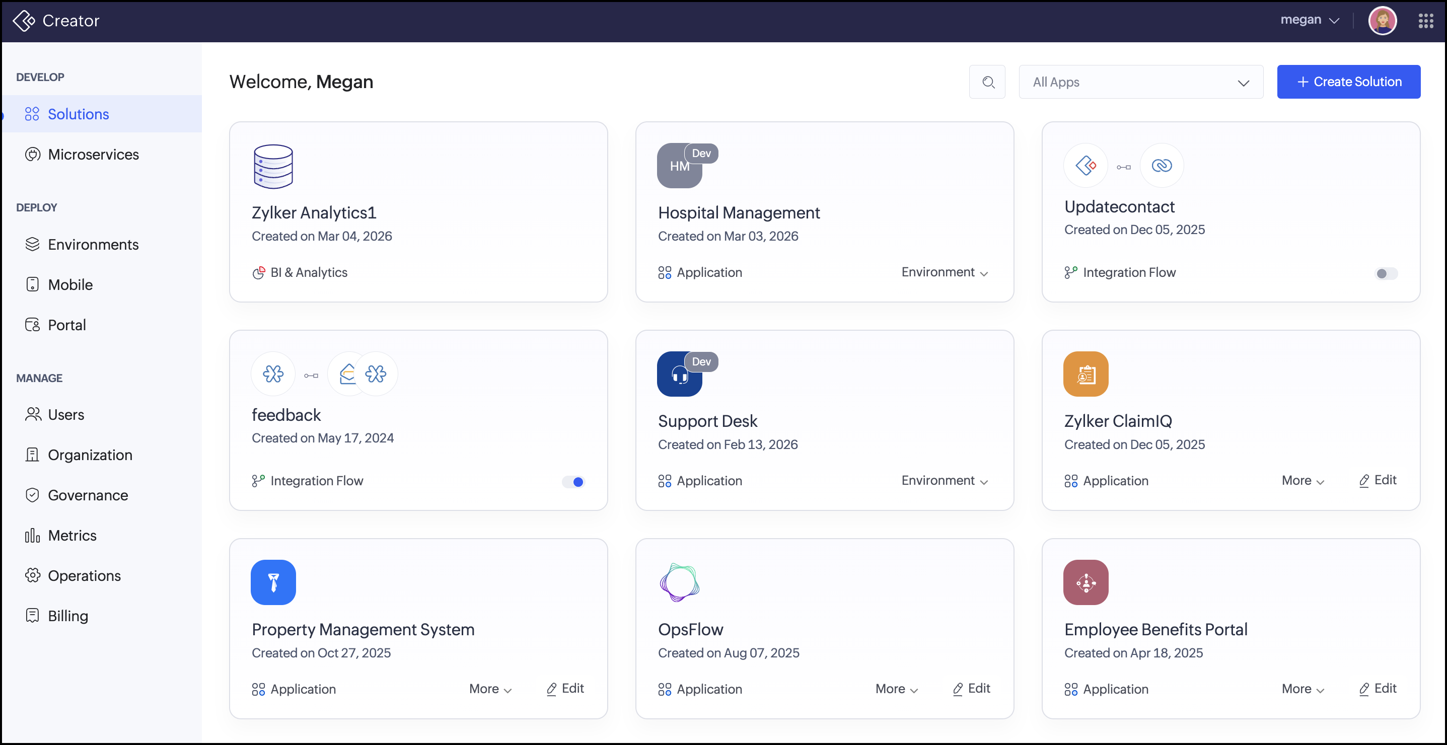 This dashboard acts as a central hub where you can view and manage all your solutions inside your selected workspace in Creator. It provides a consolidated overview with quick access to solution details, actions, and statuses, helping you efficiently organize, track, and scale your applications from a single place. You can also quickly access search, app filters, account details, and create new solutions.