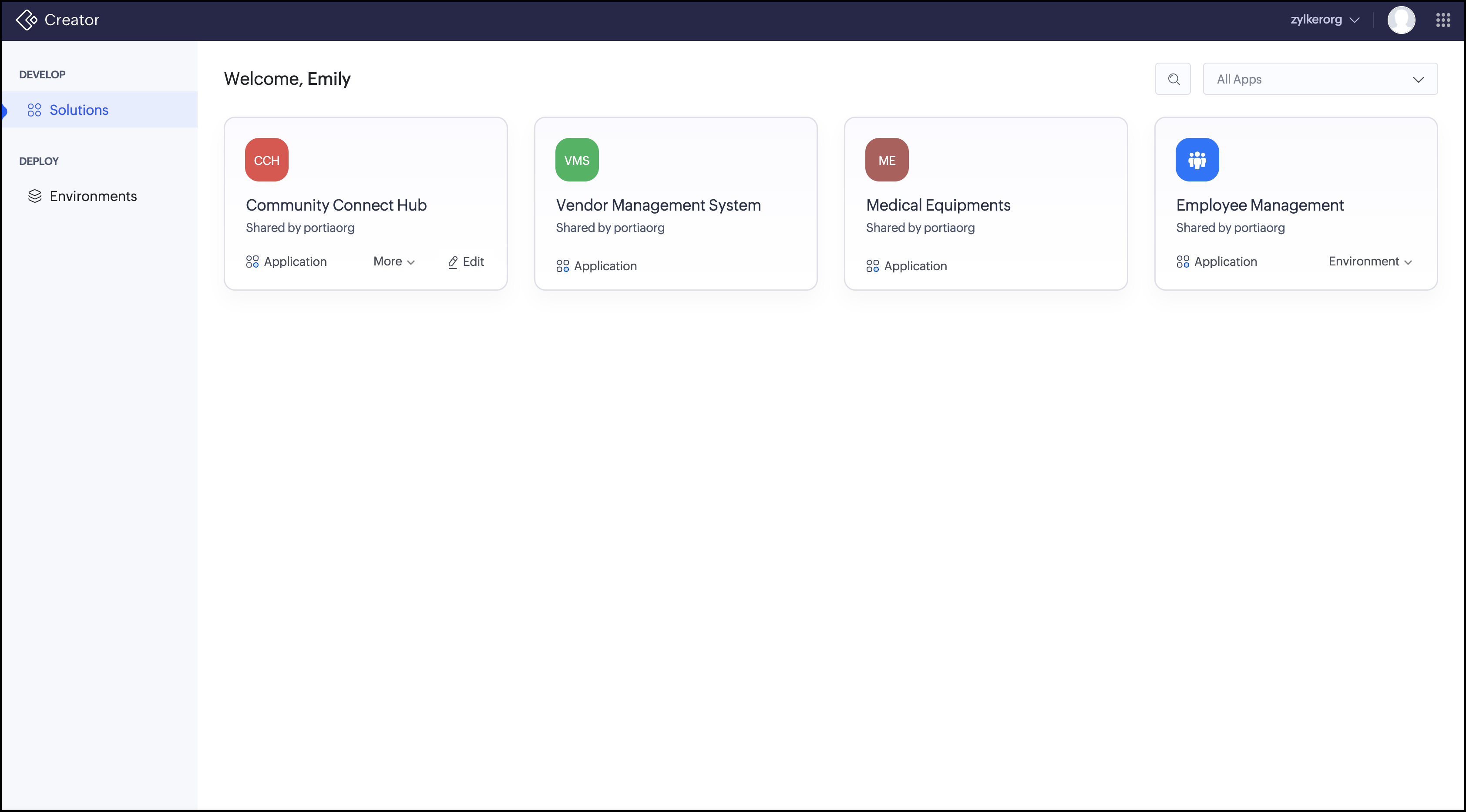 Develop | Contains essential features to help you build full-fledged solutions, along with the facility to incorporate small pieces of apps that are individually functional and can be used in your Creator apps to achieve specific business goals. | - Solutions - Lets you build and manage business applications, Bi & Analytics, and integration flows
