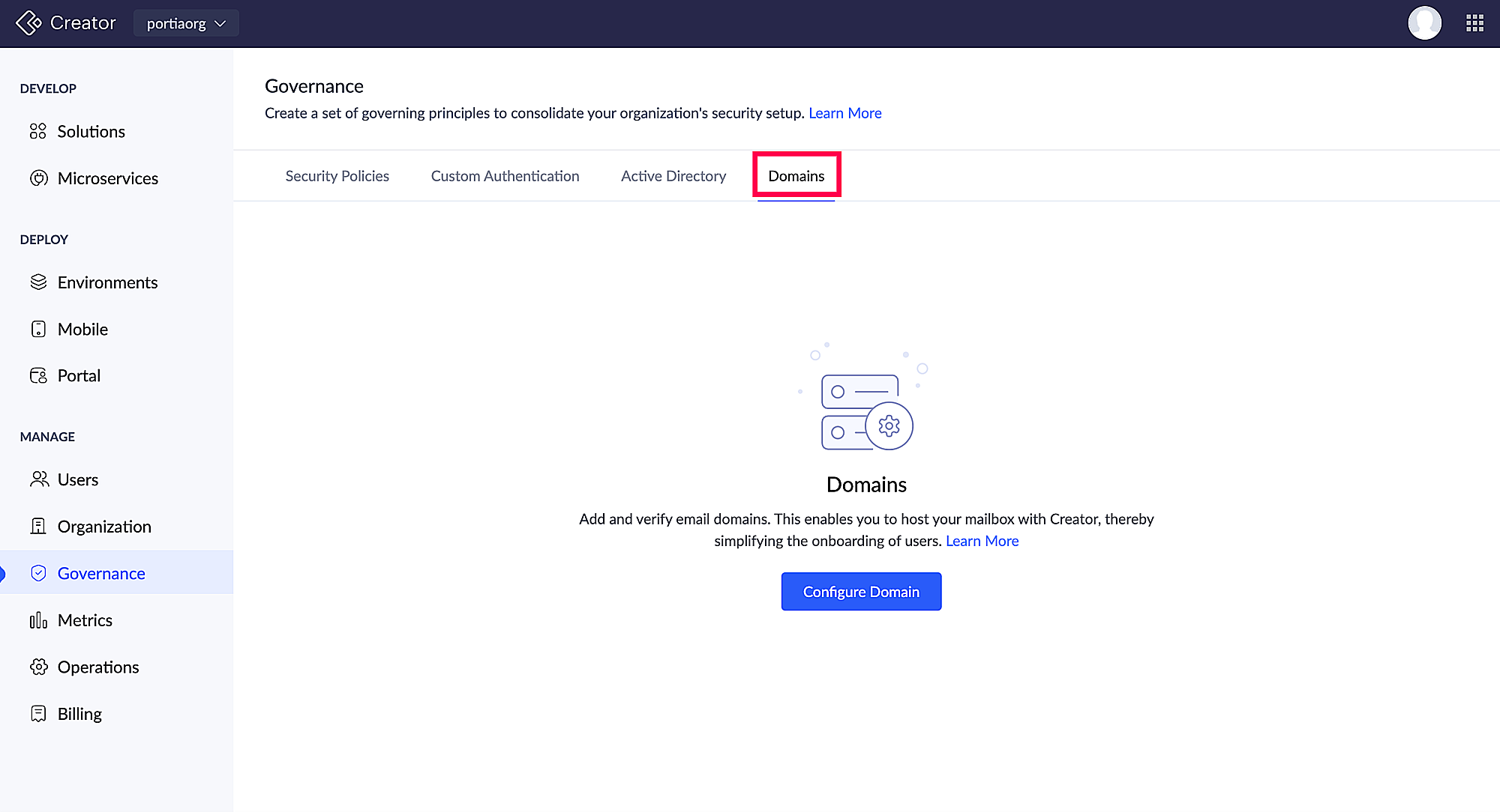 Learn how adding verified domains can help you simplify the user onboarding process, create group aliases for email communication, and host your mailbox with Zoho Mail.  This is one of the features offered in Zoho Creator under Governance.