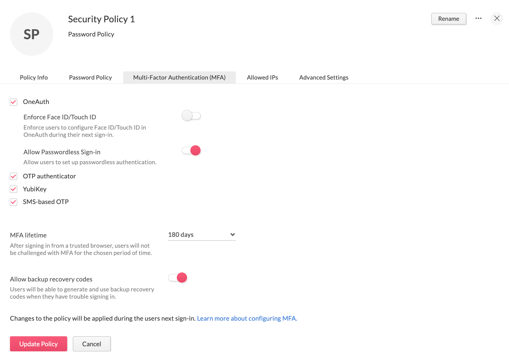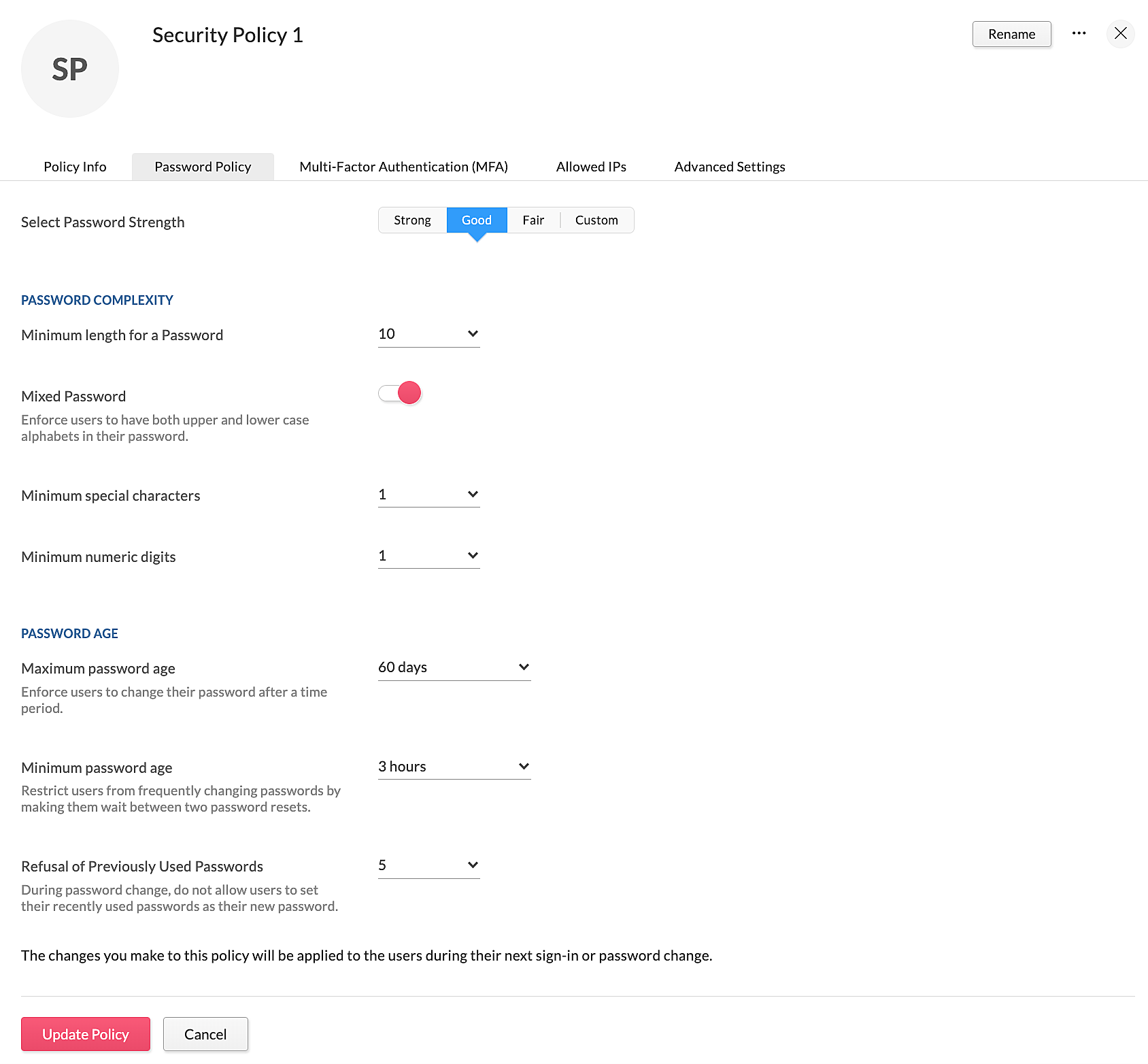- Any changes made to a security policy will come into effect during the next sign-in or reset password session that a user undergoes.
