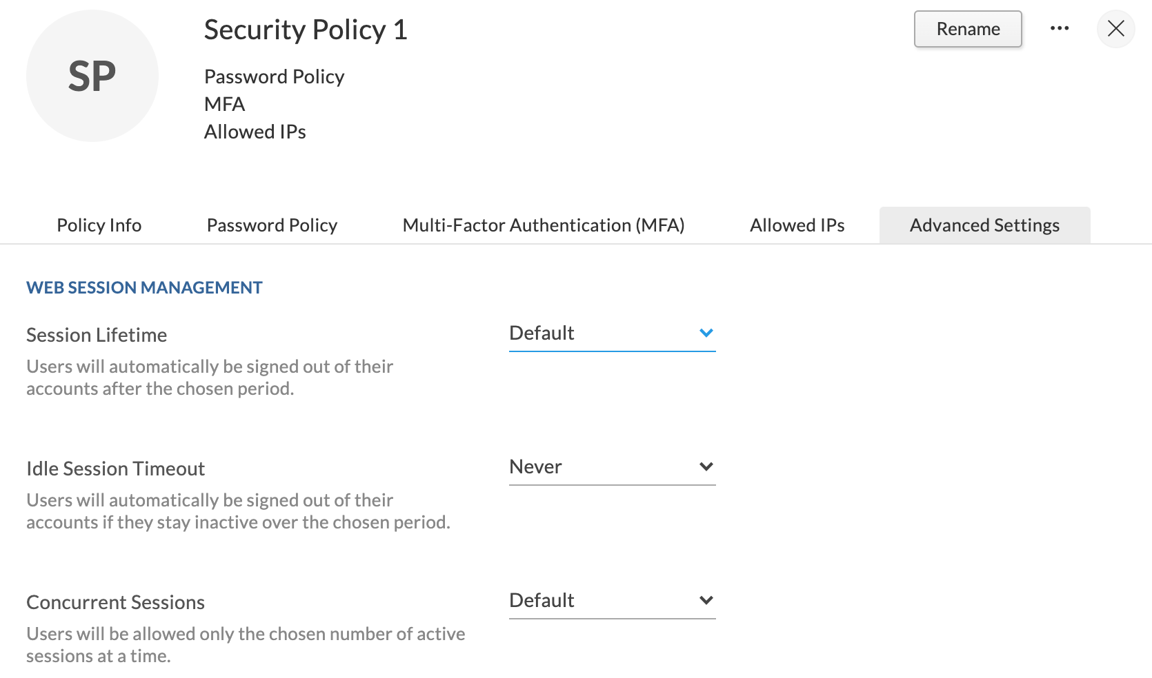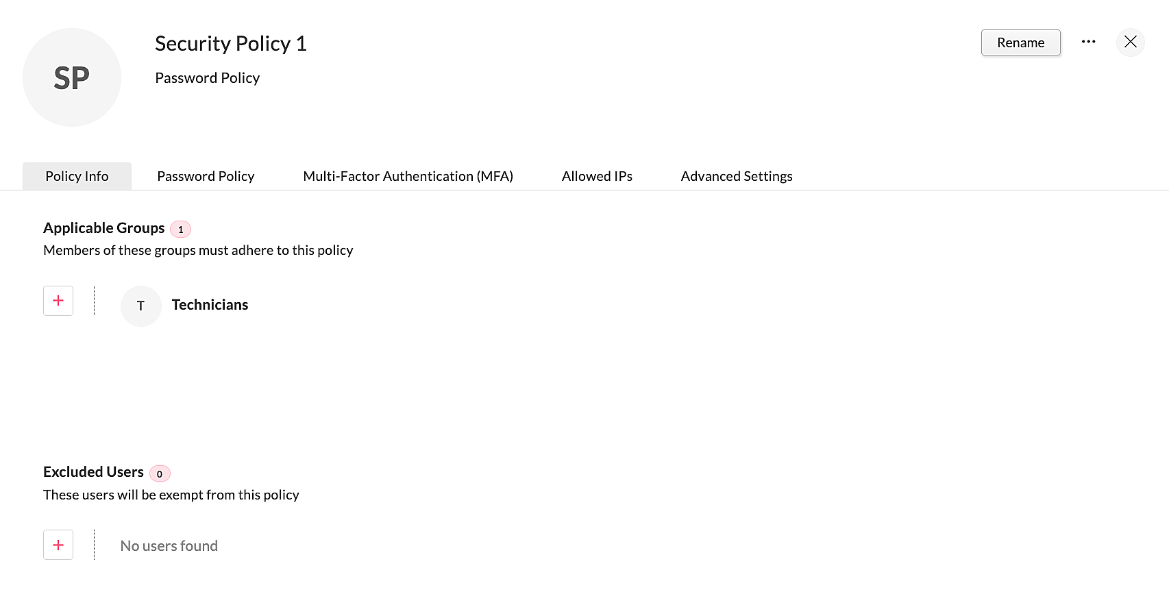 - Only the super admin and admins can access Security Policies.