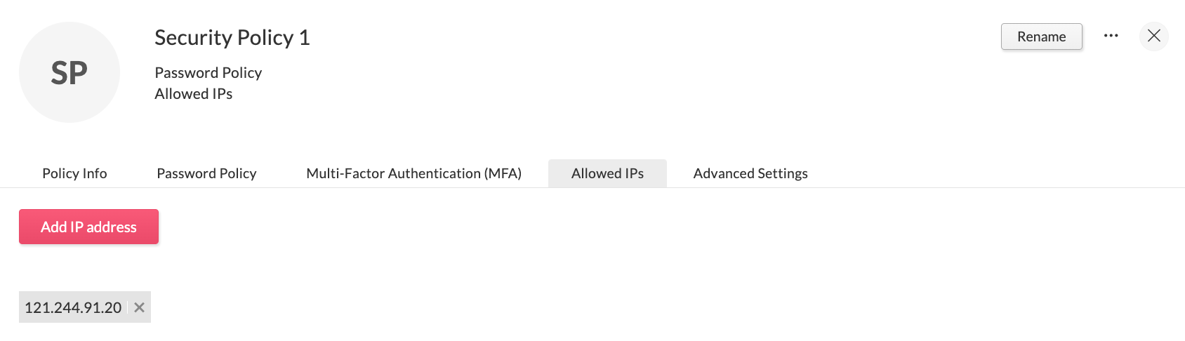 Note: If a user whitelists an IP address for themselves in Zoho Accounts and the same user has been assigned with a security policy that whitelists a different IP, they will be able to only use the IP address added in Zoho Directory's security policy.
