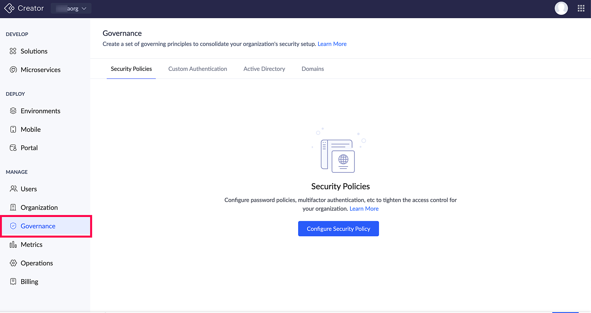 In Creator, custom authentication provides single sign-on. This allows your users to sign in to their Zoho account through a different identity provider. After they sign in to your service, they will be logged in automatically to all the linked applications within Zoho.