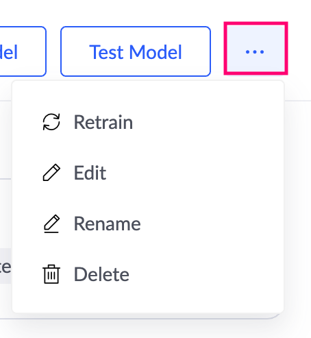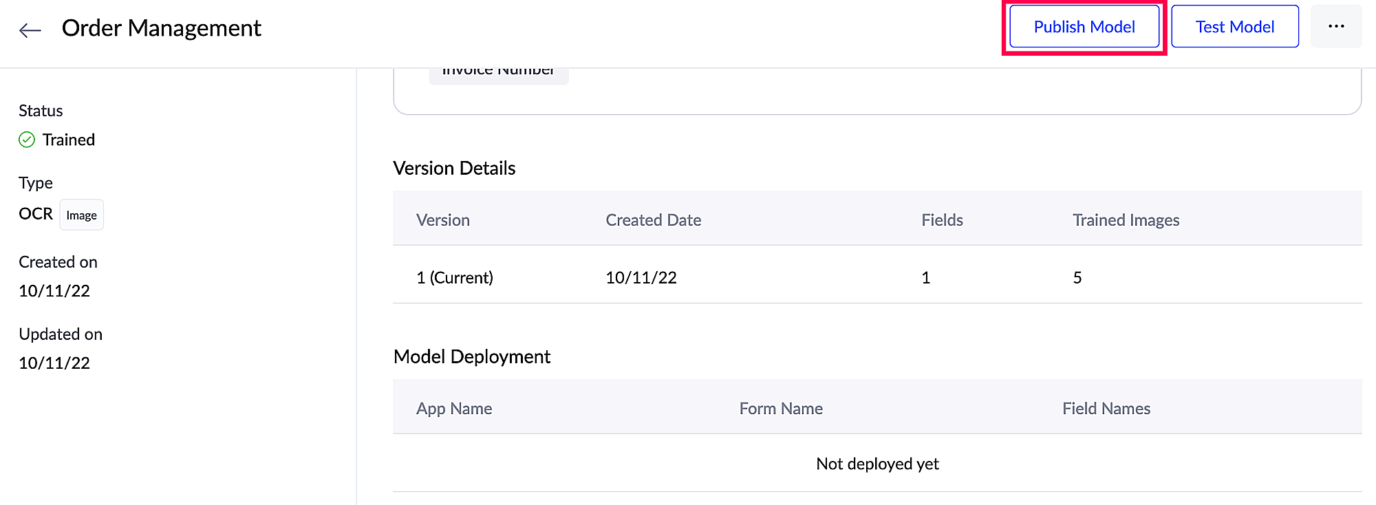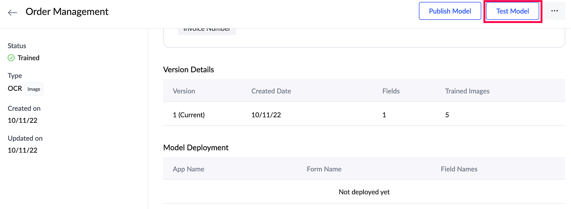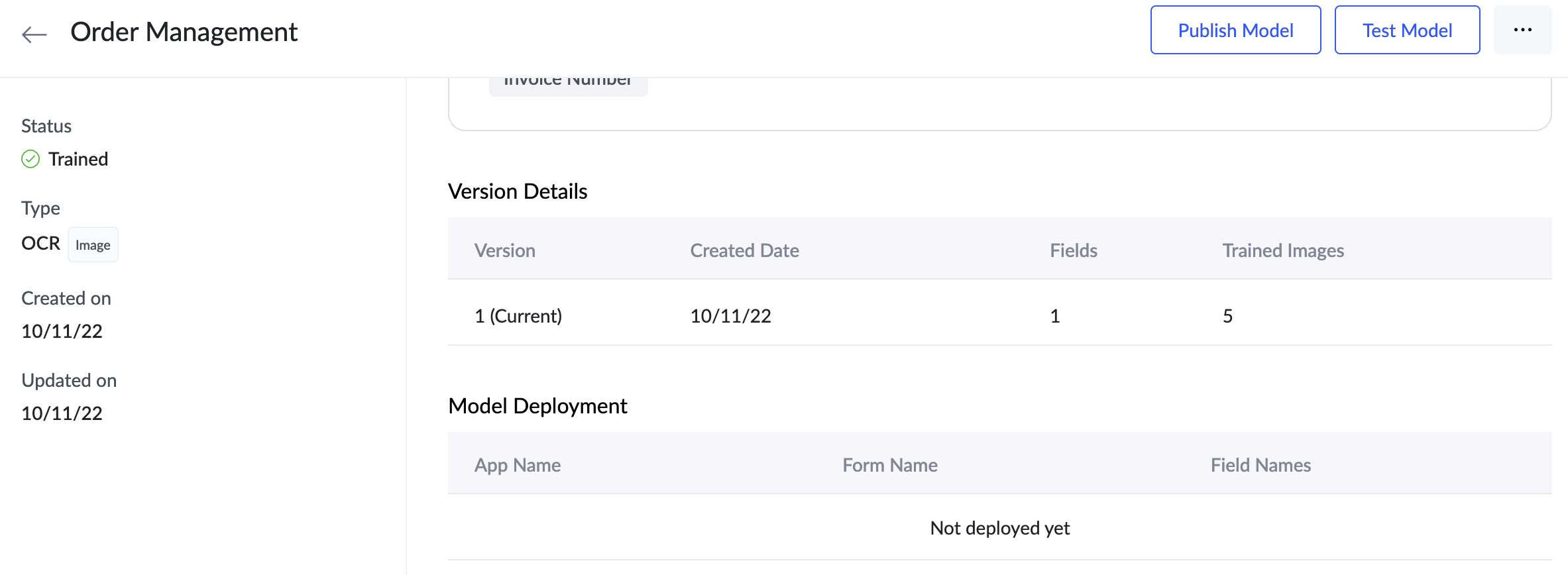 In this section, you can view the number of versions the model has, what version the model is currently running on, the model creation date, the number of fields added, and the count of trained data.