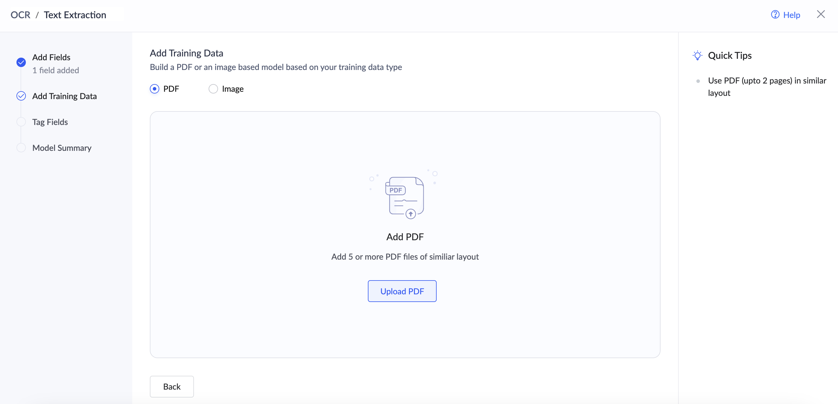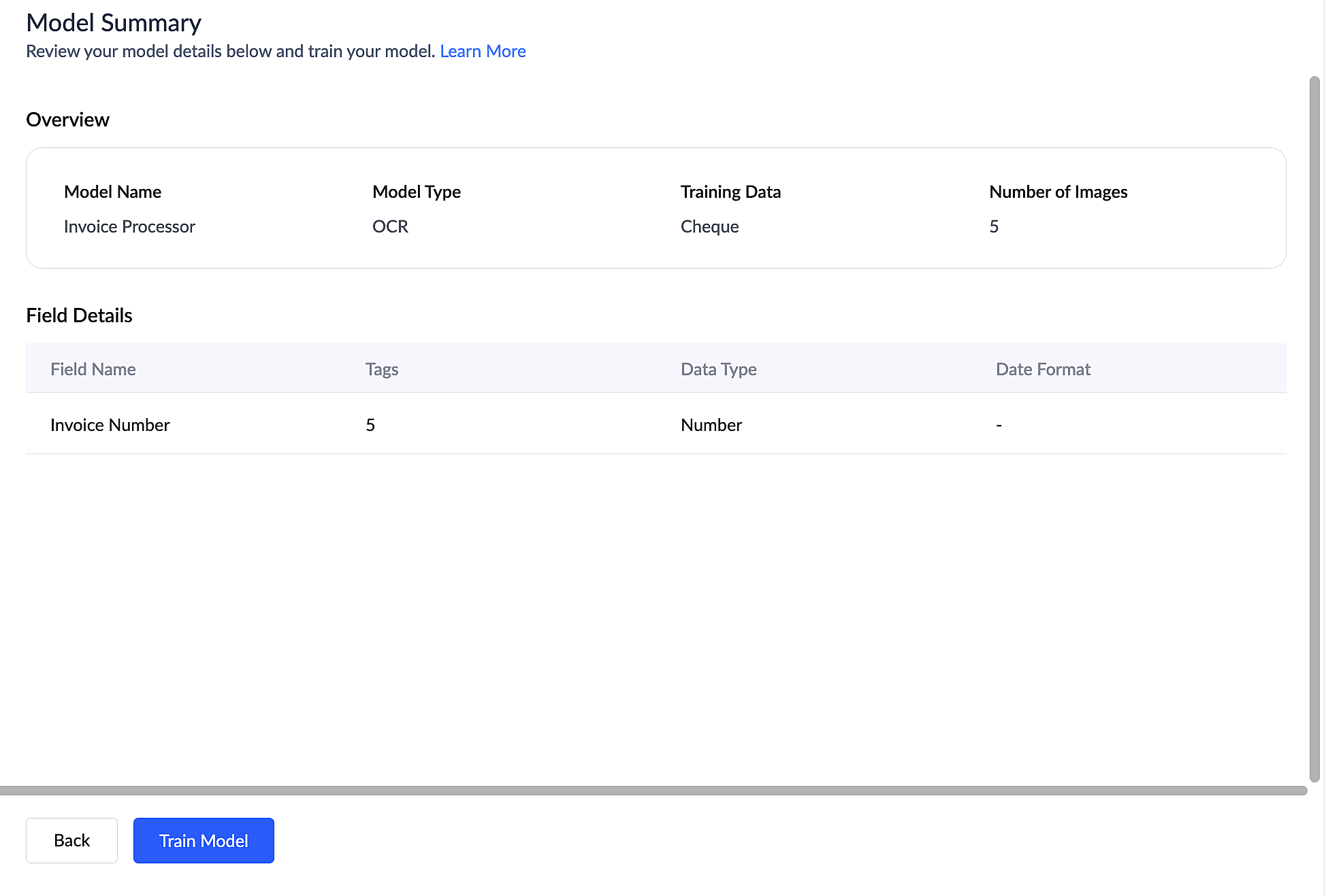 After adding the training data, you can review the model details, such as Model Name, Model Type, type of Training Data, and the Number of training data (images or PDFs) added. If you need to make any modifications, you can go back and make them. Otherwise, you can proceed to train the model.