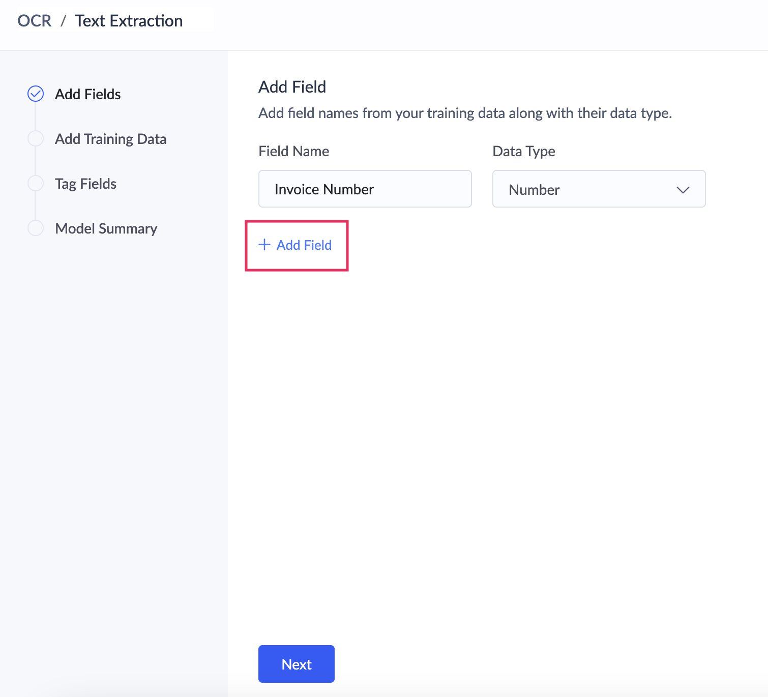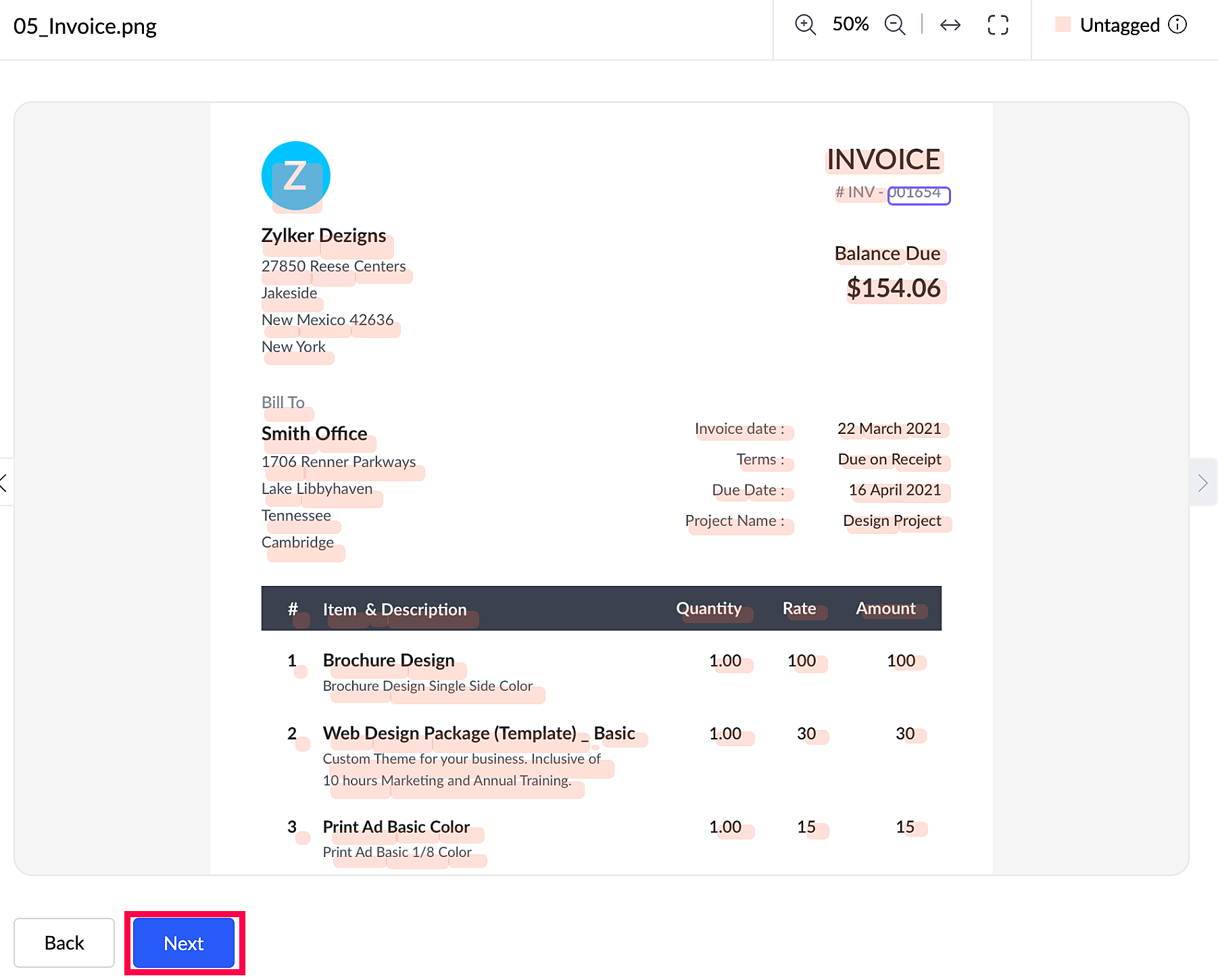 After adding the fields and uploading the required images or PDFs, you need to tag the added fields to their corresponding values in each of the training data that you've uploaded. This helps the model to learn and identify which values must be extracted from the training data. All the data that can be extracted from your training data will appear highlighted. You can now choose to extract the specific text portions for your business needs.
