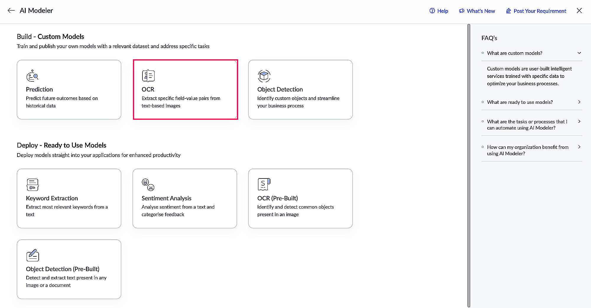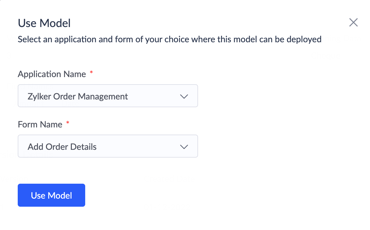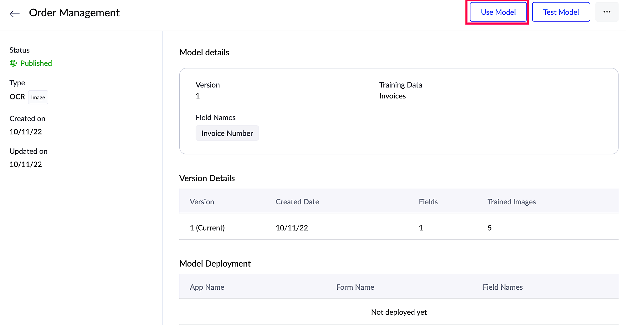 - After deletion, the added fields (model input and output fields) will remain in the form in which the respective model is deployed. The past data from the OCR model will remain as long as the respective fields are not deleted from the form.