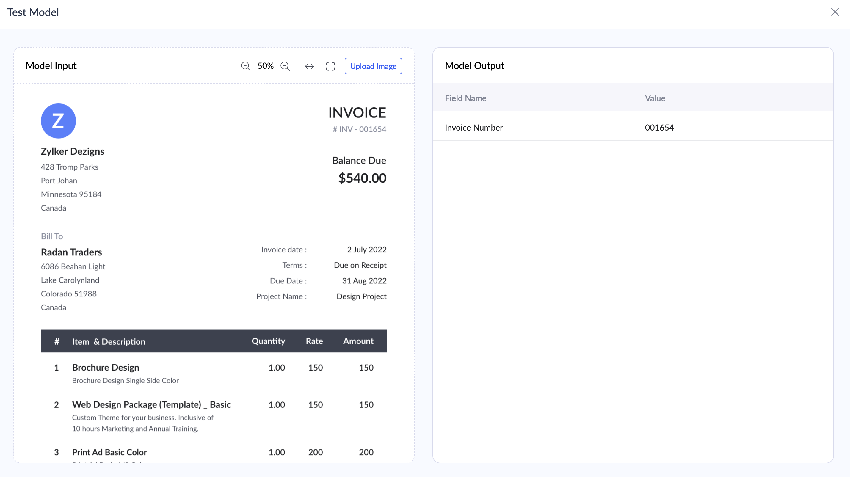 After training, you can test the model's reliability before deploying it in any of your applications. This ensures that the model identifies and extracts the required values correctly.