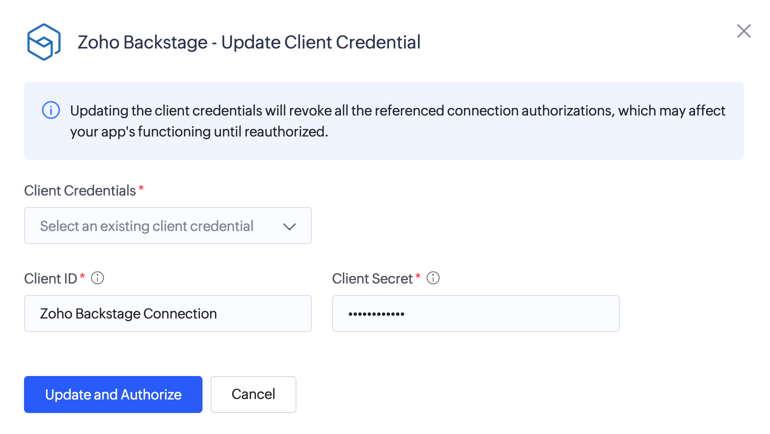 Info: Updating the client credentials revokes all existing authorizations that reference the connection. If the credential is referenced in one or more connections, all of them will be revoked. This may temporarily affect your application’s functioning until the connection is reauthorized. Ensure that the actions configured in the connection fall within the scope defined in your registered OAuth app.