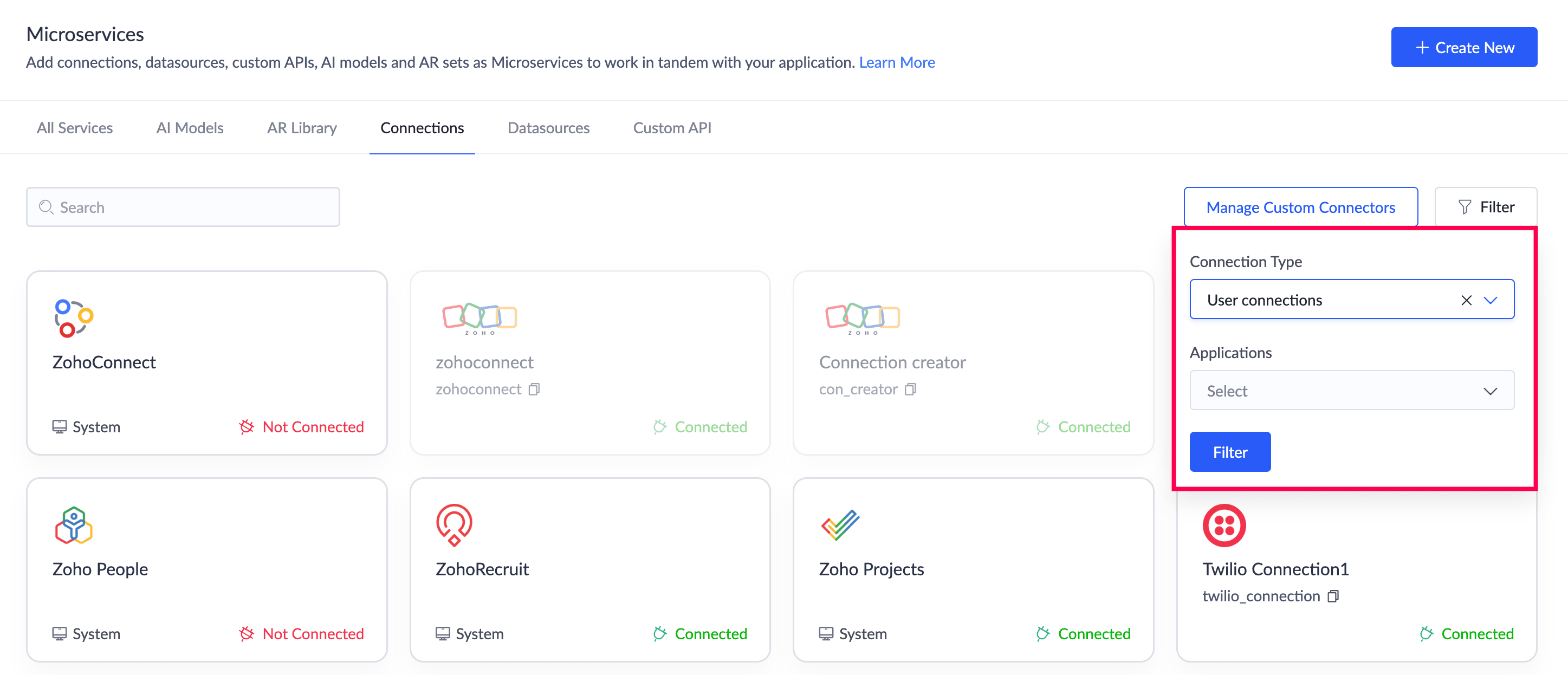 You can also use the Search box to locate a specific connection quickly or application. For example, you can search for the Zoho CRM connection and then apply filters to view only those connections associated with an application.