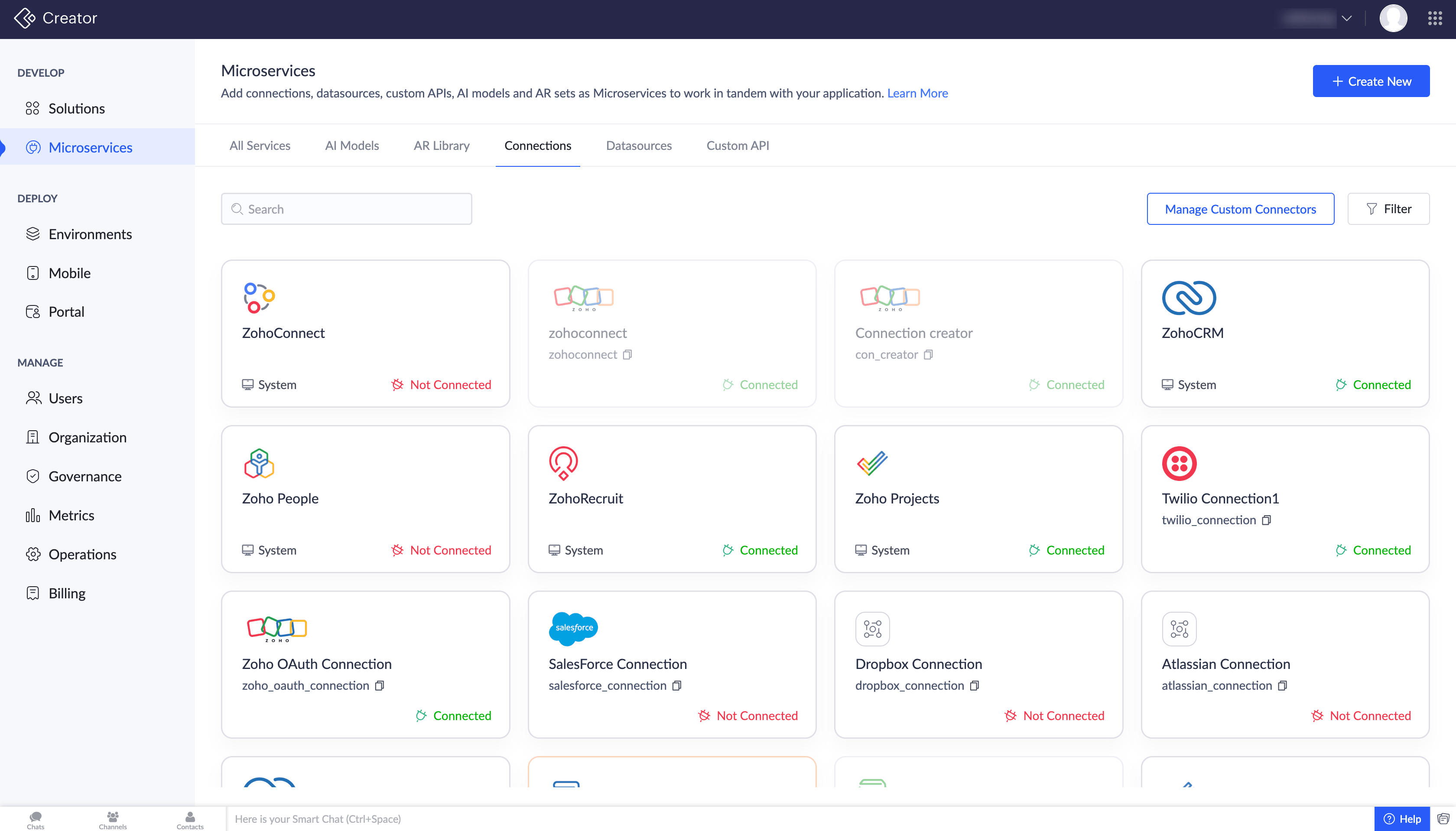 - Navigate to Microservices. All the connections available in your account will be listed under the Connections section.