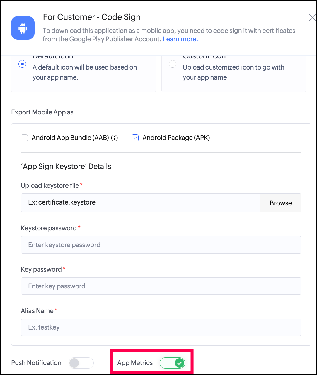 - For the same mobile app (let's say Order Management), you can opt to track metrics exclusively for Android while excluding iOS. To achieve this, you must enable app metrics during the Android code signing process but leave them disabled during the iOS code signing process for this app.