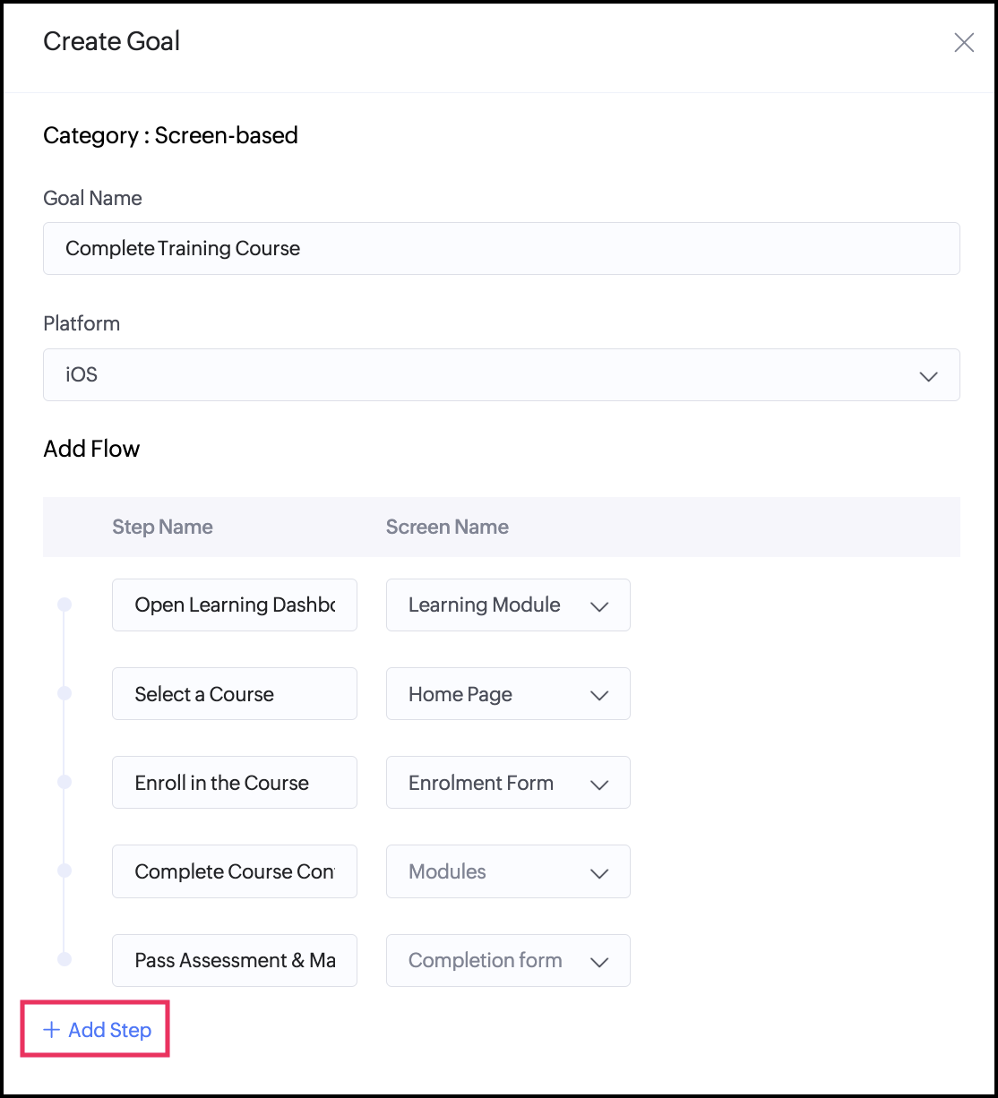 Currently, you can create a flow based on the screen traversal in your mobile application. To do this, you can associate existing screens to each of the added steps for your goal.