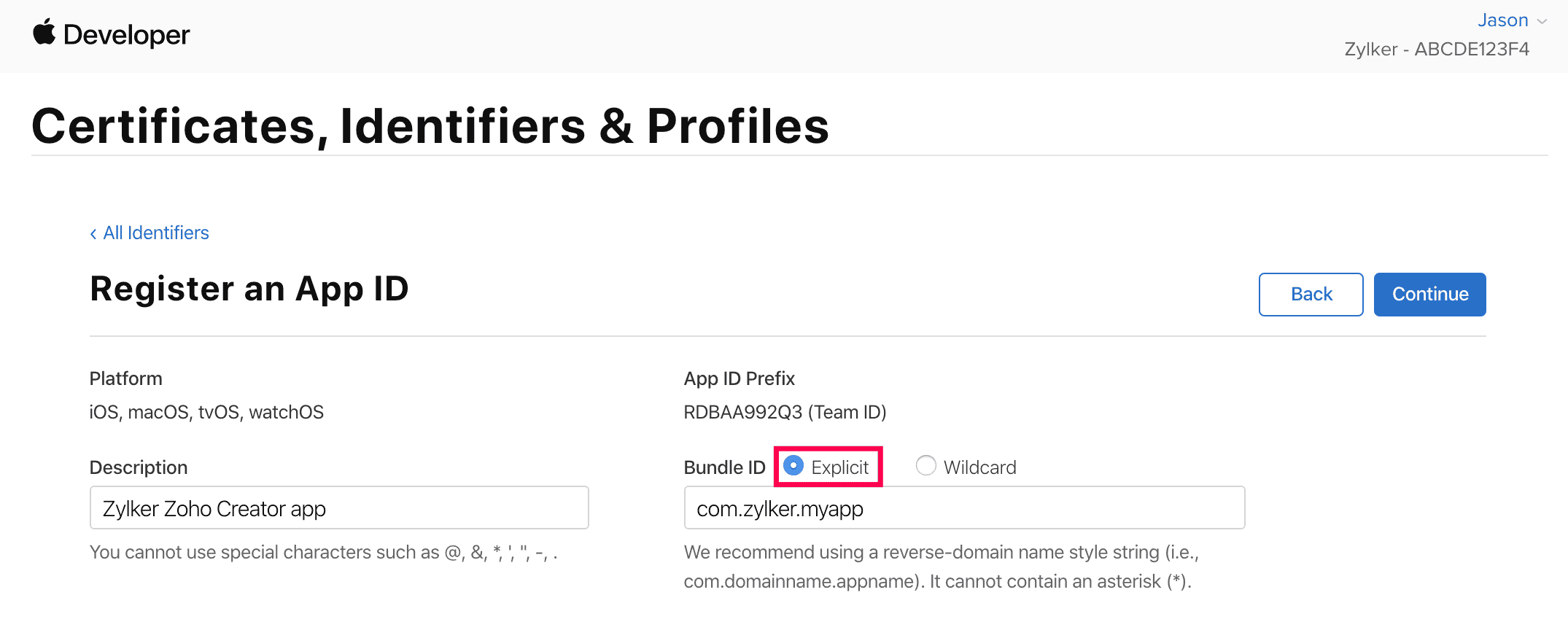 5. Select Explicit, then enter the Bundle ID and Description (optional) for your iOS app, and then click Continue.