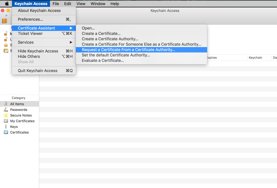 3. Select Certificate Assistant, then select Request a Certificate from a Certificate Authority.