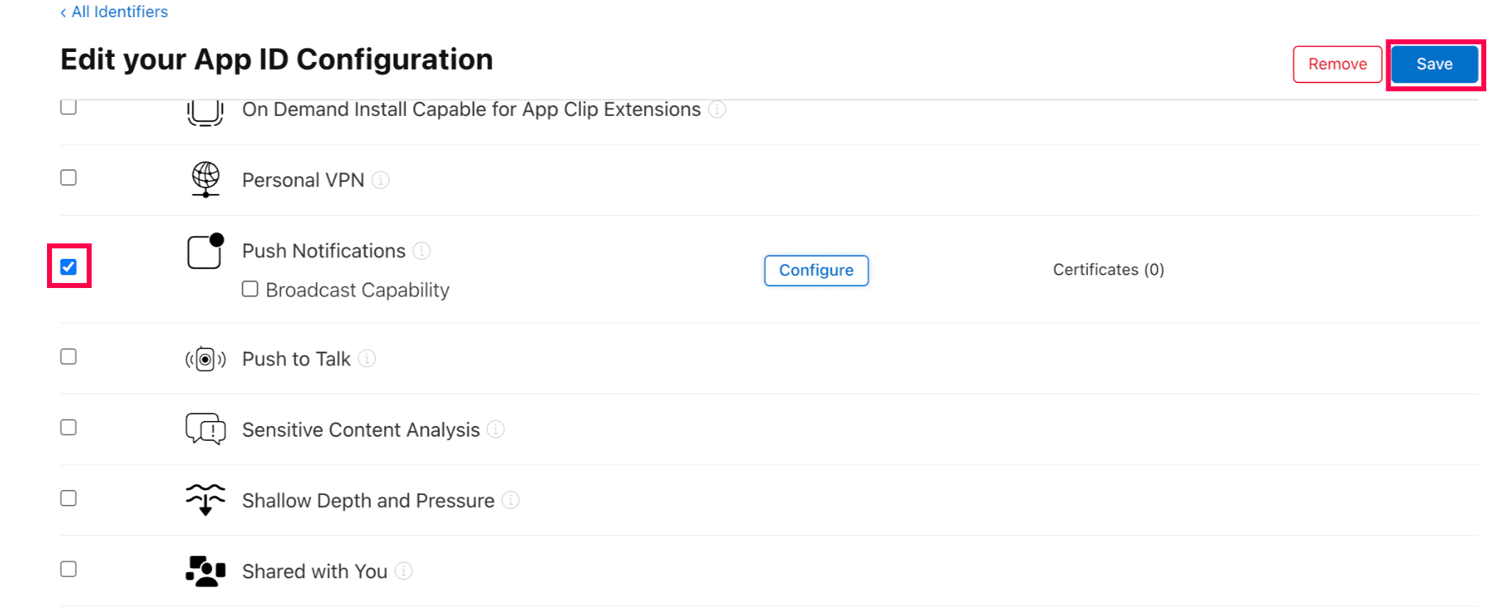 12. Check the Push Notifications checkbox under the Capabilities section, then click Save.