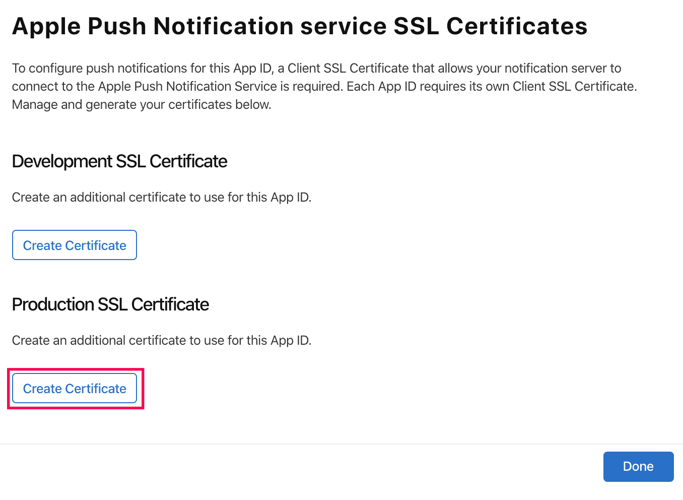 13. Click Create Certificate under the Production SSL Certificate section, then click Done.