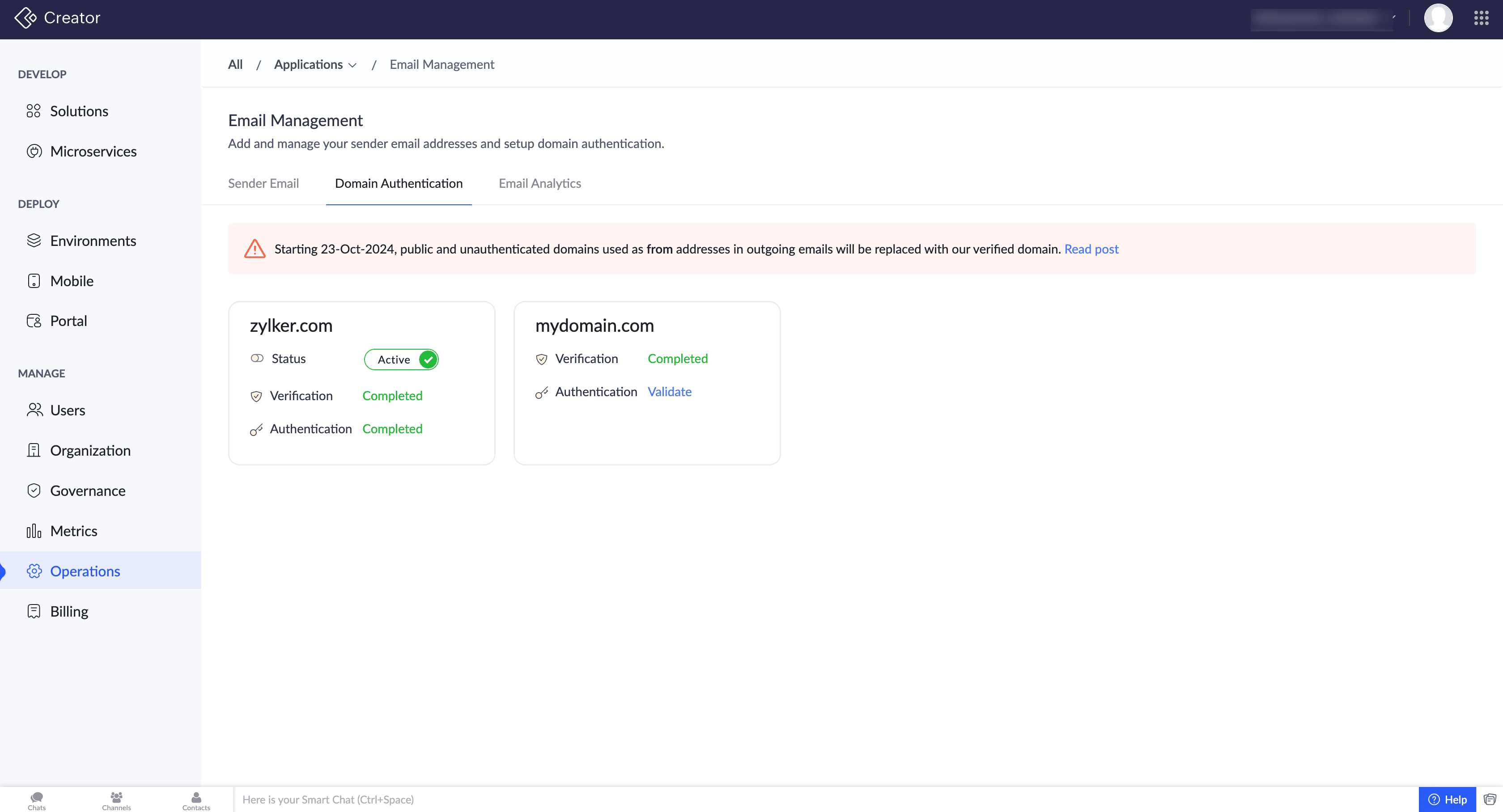 The domain authentication process has two steps, which are listed below. You can also delete a domain.